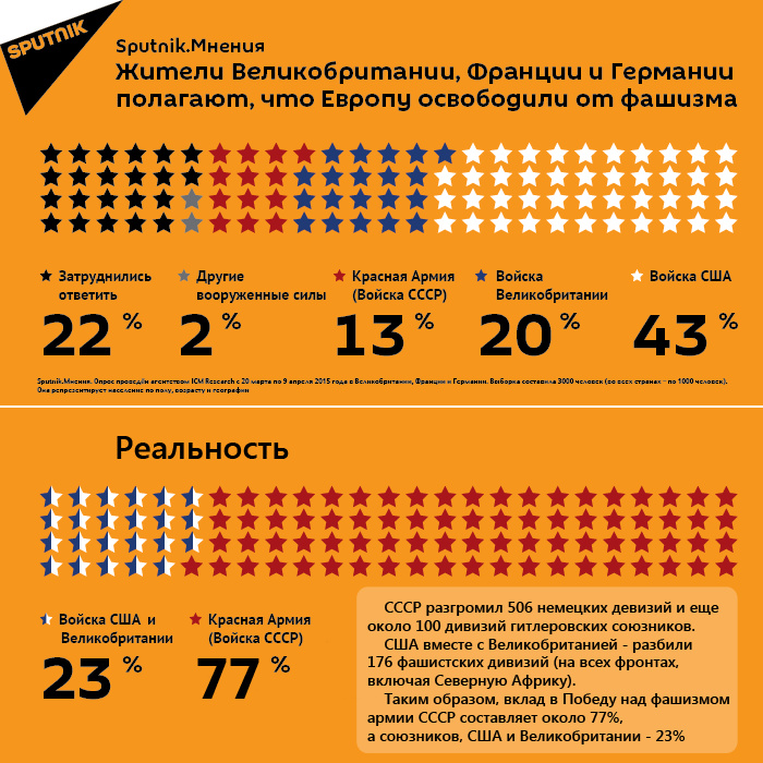 Британское агентство ICM Research в ходе проекта «Sputnik.Мнения» с 20 марта по 9 апреля провело опрос 3 тысяч жителей Великобритании, Германии и Франции, чтобы определить, кто, по их мнению, внес решающий вклад в освобождение Европы от фашизма. В каждой стране опрашивалось по тысяче человек.