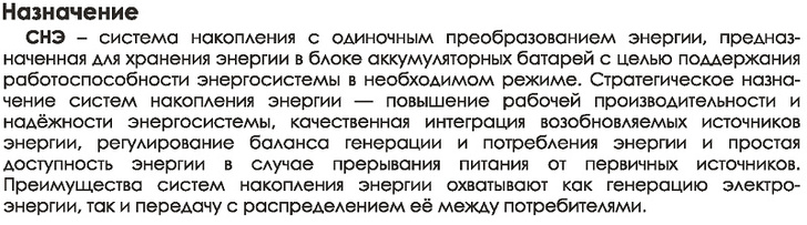 Система накопления энергии позволяет аккумулировать электричество, которое вырабатывается различными устройствами и в дальнейшем его использовать. Она также поддерживает работу общей энергосистемы, повышая надежность передачи тока.