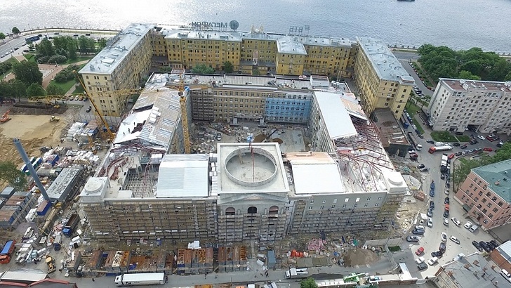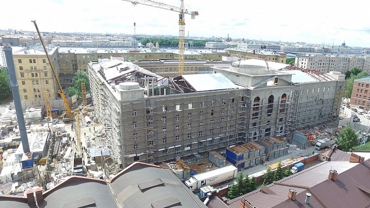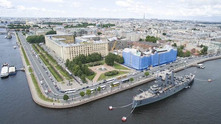 На Петроградской набережной (напротив крейсера «Аврора») идет реставрация оконных заполнений, фасадов, медной кровли и декоративных элементов дымовых труб знаменитого «Училищного дома имени Петра Великого» — ныне исторического пятиэтажного административно-учебного корпуса НВМУ.