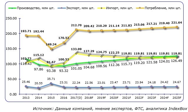 Динамика и структура рынка подшипников в 2013-2017 (О) гг. и прогноз до 2025 г., млн шт. (в рамках базового сценария развития