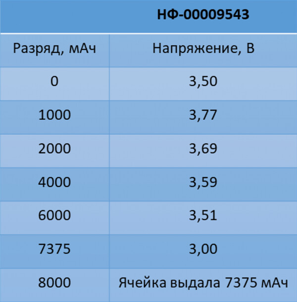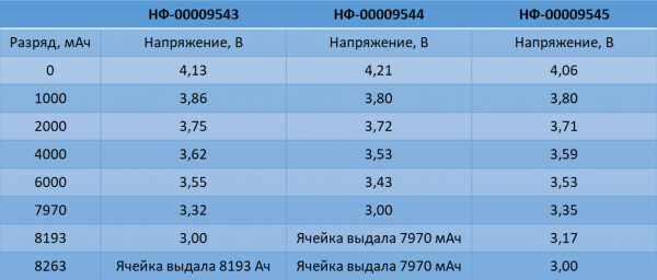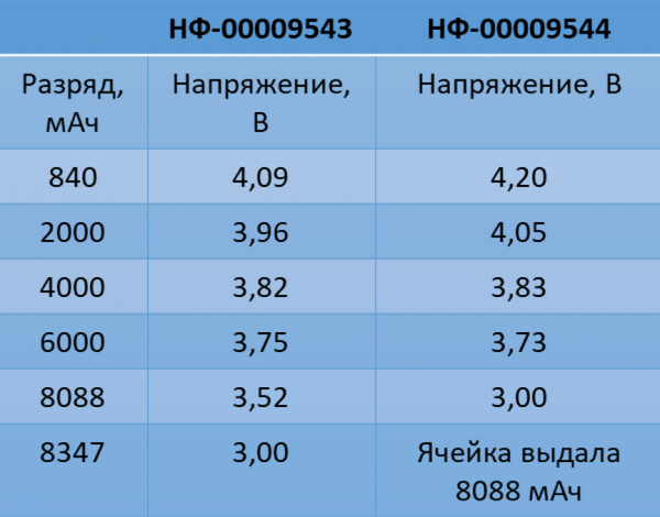 Ячейки НФ-00009543 и НФ-00009544 не тестировались при токоотдаче 0,2C, так как стандартный токоотдача согласно их даташитам — 0,5C.