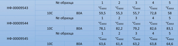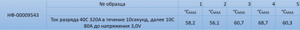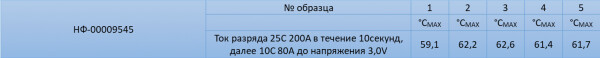 Ячейки НФ-00009545 прошли тестирование при импульсной токоотдаче без повышения температуры образцов свыше 63 градусов по Цельсию.