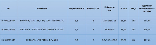 - НФ-00009544 — напряжение 3,8 В, самые маленькие размеры из 3-х тестируемых, самая легкая ячейка с наивысшей удельной энергоёмкостью, токоотдача 15C;