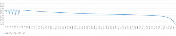 Производителем элемента НФ-00009545 заявлена пиковая токоотдача 25C, с просадкой напряжения до 3,5 В — ячейки успешно прошли тестирование.