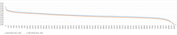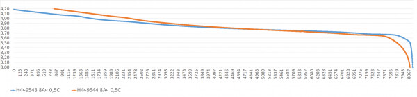 Ячейка НФ-00009543 выдала на 3% больше емкости, чем ячейка НФ-00009444 (8347 мАч против 8088 мАч).