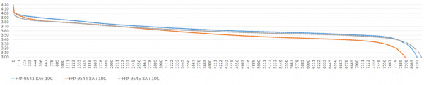 На графике наглядно показано, что ячейки НФ-00009543 показывают меньшее падение напряжения, чем другие ячейки при токоотдаче 10C.