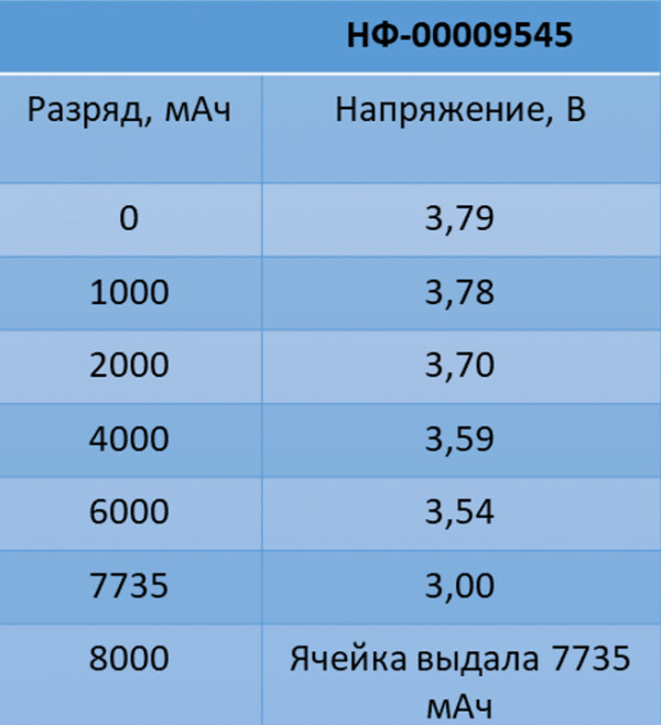 Ячейка НФ-00009545 выдала наибольшую емкость, по сравнению с НФ-00009543 и НФ-00009444, при этом напряжение при разряде до 7889 мАч было ниже, чем у ячейки НФ-00009543.