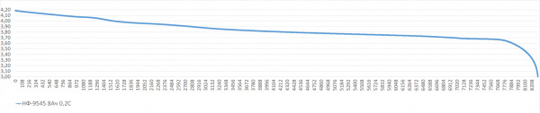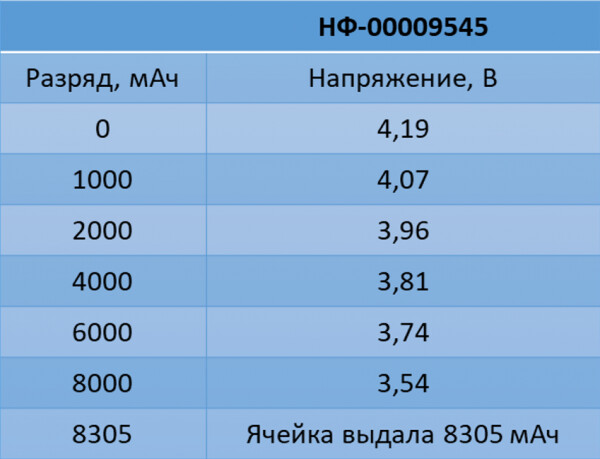 Ячейку НФ-00009545 на первом этапе протестировали при токоотдаче 0,2C — стандартная токоотдача из даташита этой ячейки. По итогам теста ячейка выдала 8305 мАч.