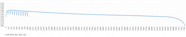 Производителем элемента НФ-00009543 заявлена пиковая токоотдача 40C, с просадкой напряжения до 3,5 В — ячейки успешно прошли тестирование при такой токоотдаче.