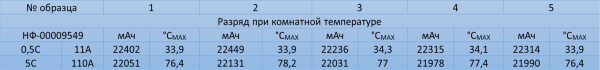 На токоотдаче 0,5C ни один из образцов не превысил температуру 35 градусов по Цельсию, тестирование пройдено успешно;