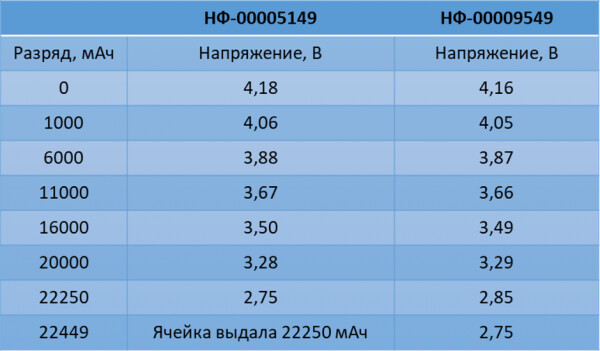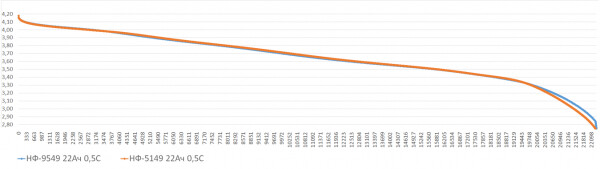 Синим показан график разряда новой ячейки 22 Ач (НФ-00009549)