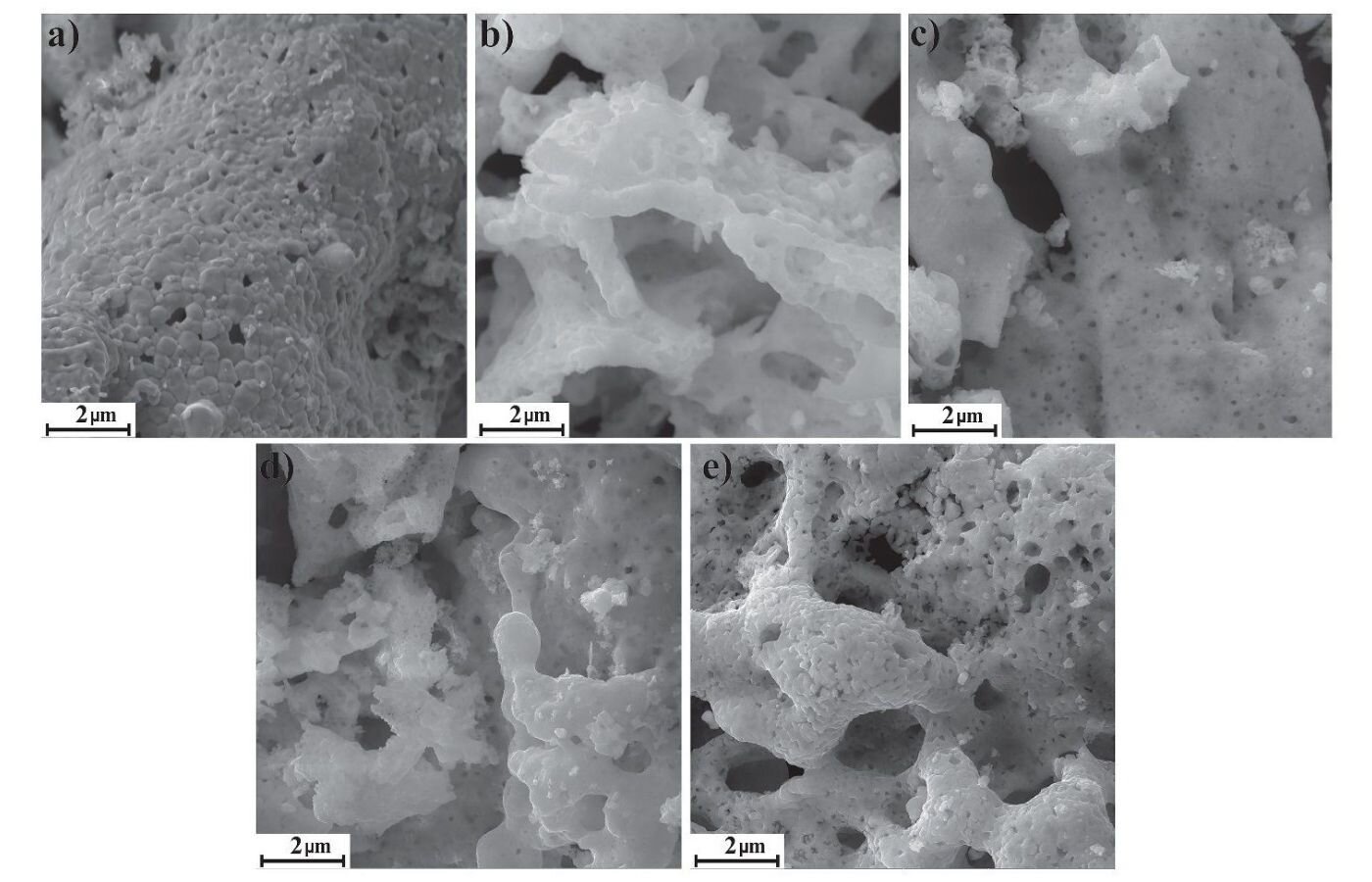 Структура исходного материала (а) и образцов, в которых 5% (b), 10% ©, 15% (d) и 20% (e) атомов висмута заменено на гадолиний. Источник: Gyulakhmedov et al. / Journal of Materials Chemistry C