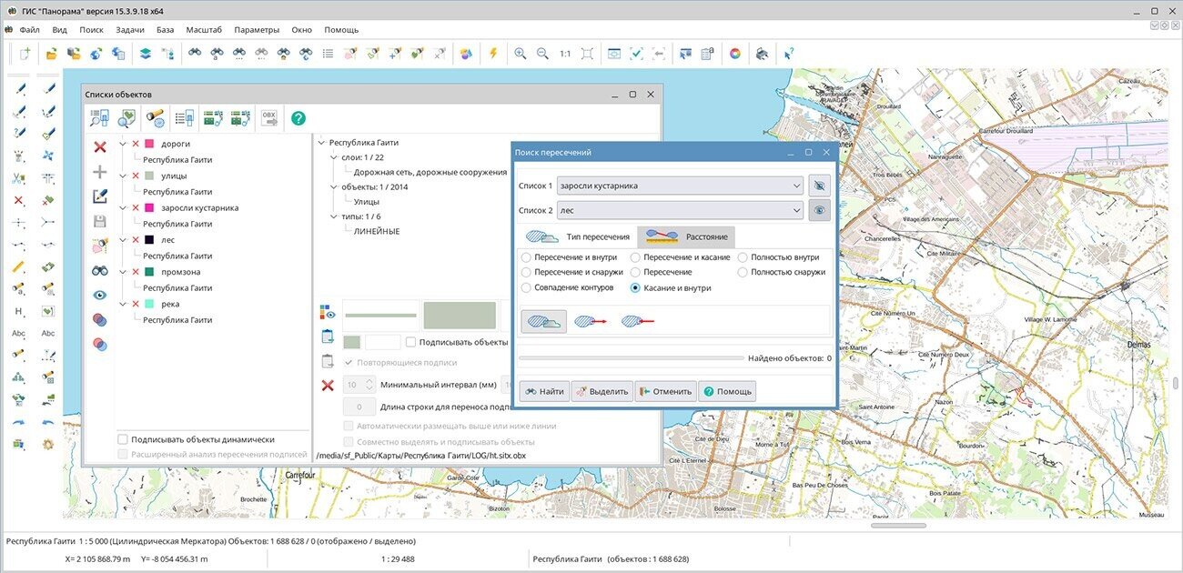 В диалоге «Списки объектов» добавлен режим поиска «Внутри и касание». Результатом поиска являются объекты первого списка, расположенные полностью внутри объектов второго списка или имеющие касания контуров объектов изнутри.