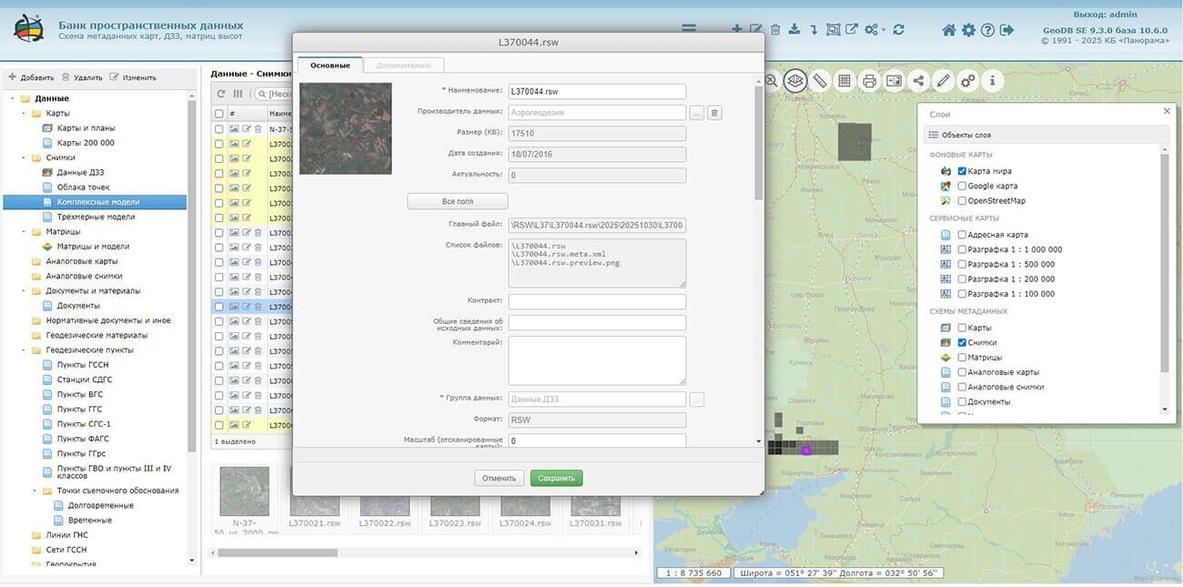 В КБ «Панорама» разработан Банк данных цифровых карт и ДЗЗ версии 9.3.0. В программе реализована возможность организации работы с новыми видами данных, например, облаками точек, трехмерными и комплексными моделями, включающими ортофотопланы и матрицы высот. Администратор комплекса сам добавляет и настраивает вид данных, задает список полей метаданных и порядок их отображения. При помещении в хранилище все данные обрабатываются по заранее определенным правилам, заполняются все необходимые метаданные. Расширение списка данных позволяет учесть особенности фондов пространственных данных федерального значения и крупных компаний.