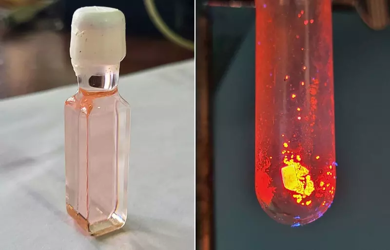 Слева: раствор комплекса; справа: свечение кристаллов комплекса двухвалентного олова. Фото: Владимир Додонов