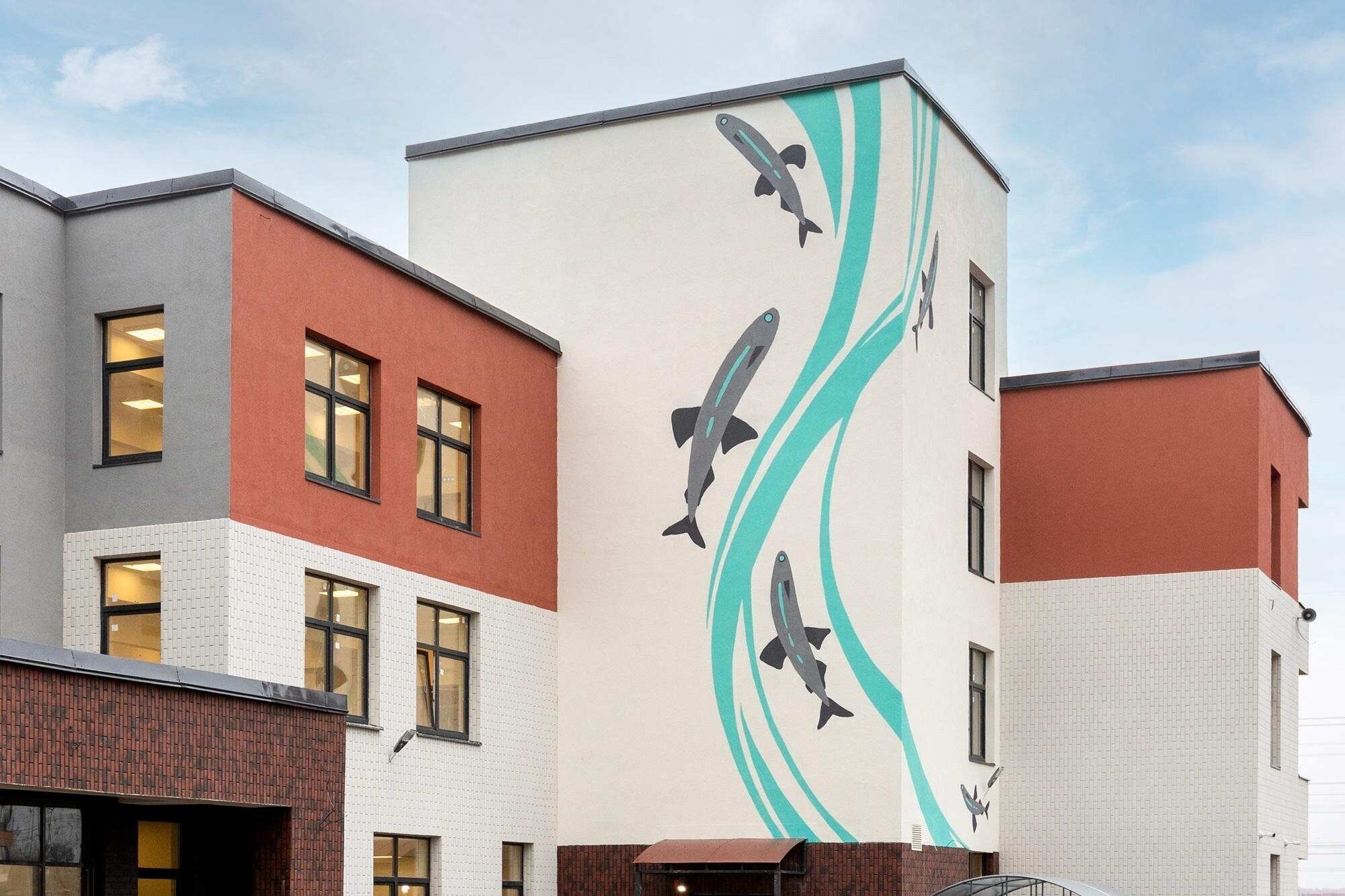 Здание с яркими фасадами, украшенными изображениями корюшки — символа Ленинградской области, построено с учетом всех современных требований.