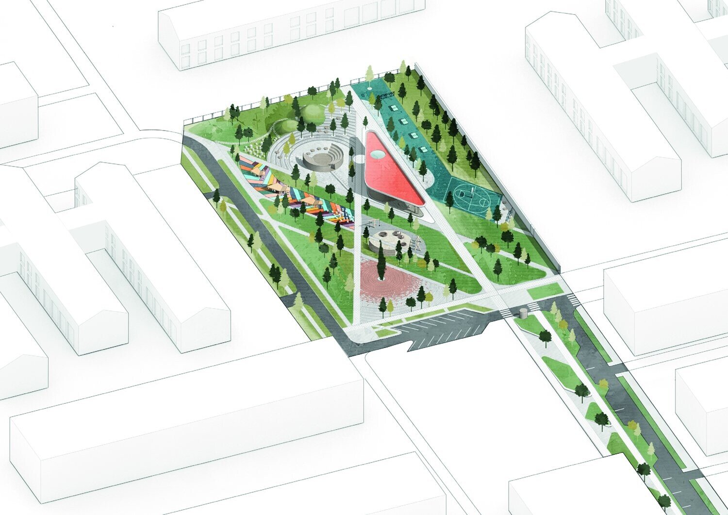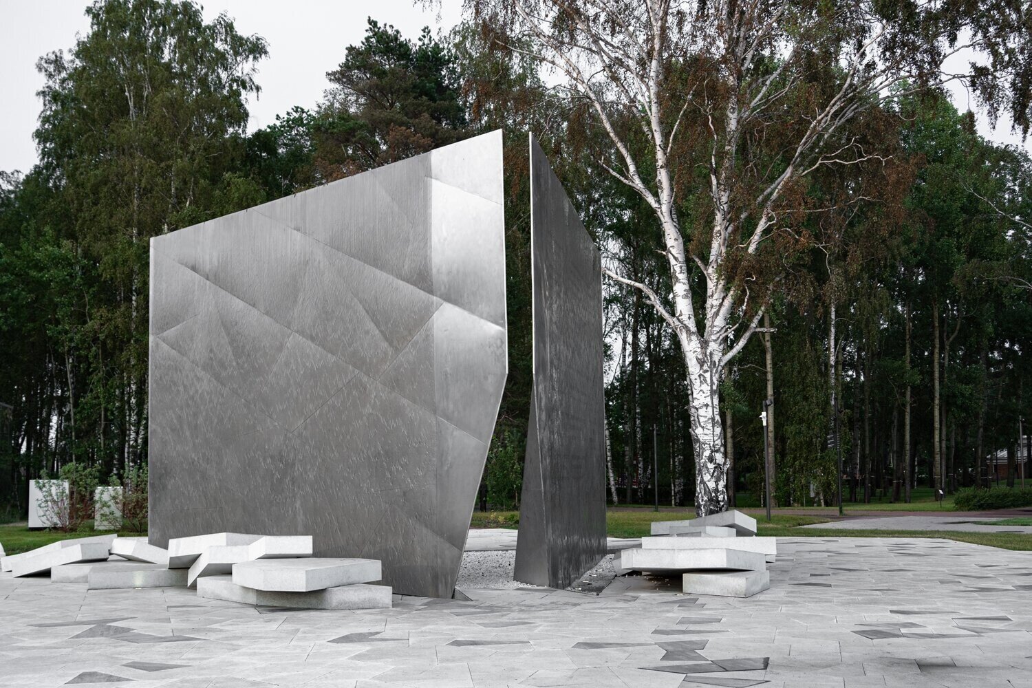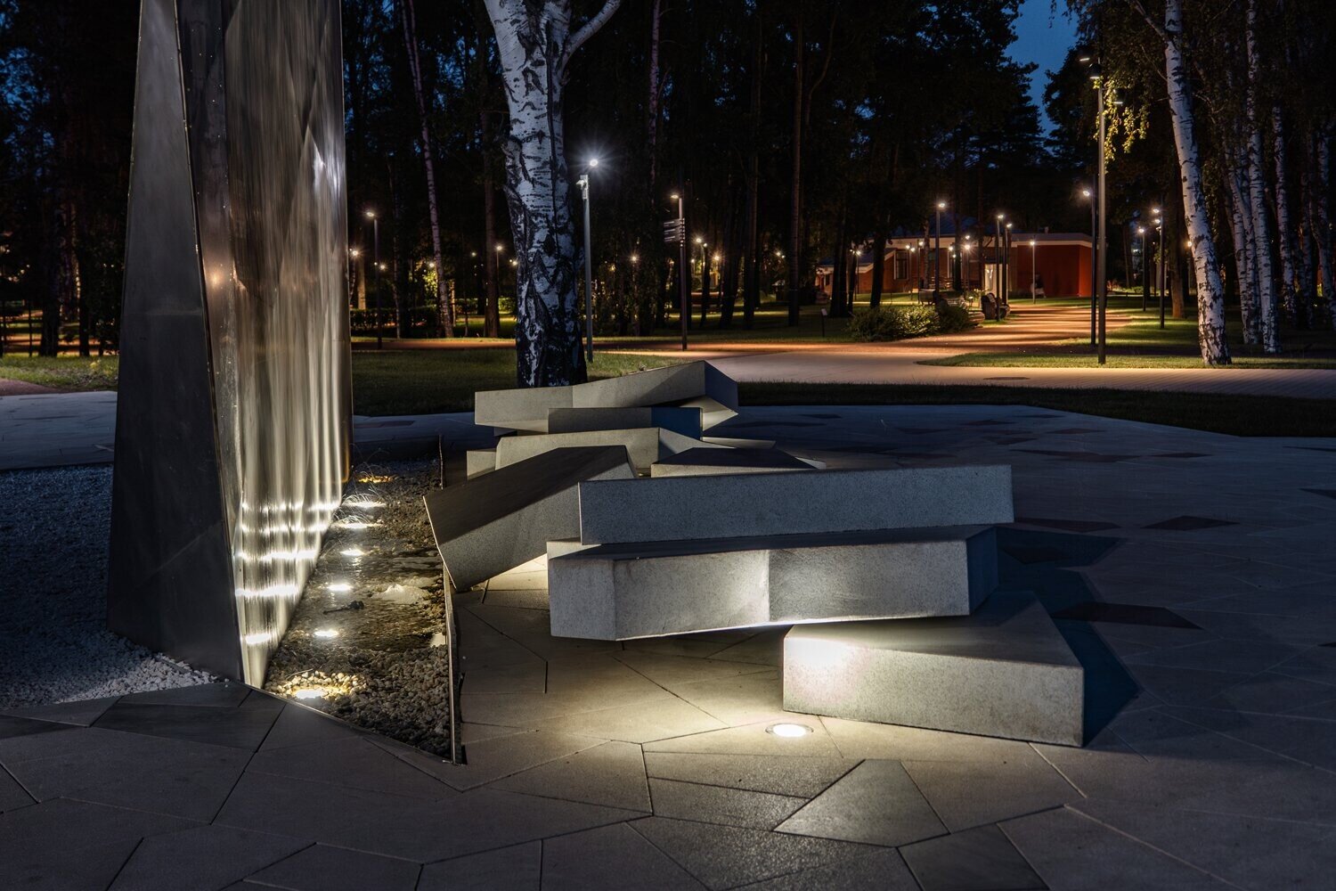 Мы нашли образ в самом природном явлении — в трескающемся льде. Форма площадки развита как фрагмент ледяного поля, расколотого весенним солнцем: асимметричная, острая, будто застывшая в движении.