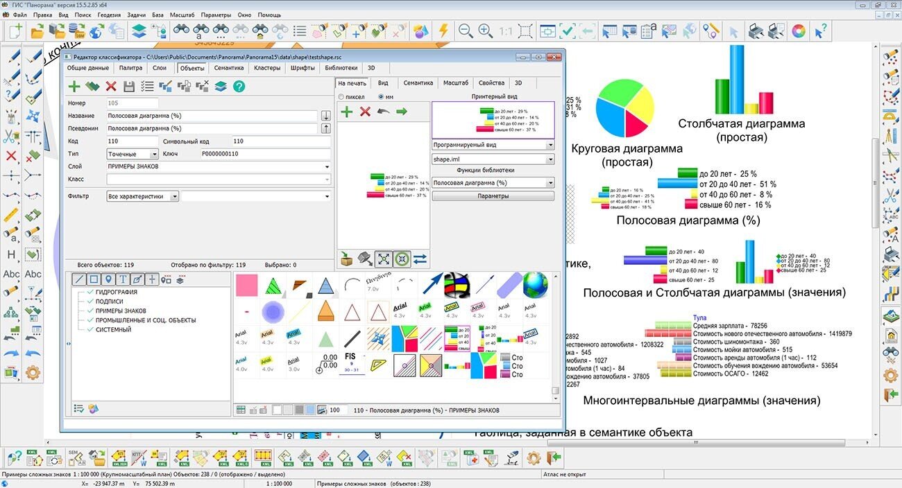Доработана библиотека программируемых знаков shape.iml64. Разработаны знаки типа „Полосовая диаграмма“. Новые виды знаков дополняют столбчатые диаграммы и используются для показа на тематических картах данных демографической, экологической, финансовой и иной статистики. Знаки имеют легенду со значениями семантики или процентами от суммы значений. В столбчатые и полосовые диаграммы добавлены блики и тени, придающие им объемный вид. В диаграммах со значениями реализованы два вида: простой и многоинтервальный. Простой вид основан на вычислении размера полос относительно Ожидаемого среднего значения. При назначении нулевого среднего значения полосы диаграммы содержат многоинтервальную шкалу, позволяющую отображать значения в диапазоне от единиц до миллиарда. Отображаемые полосы (столбцы) разбиты на интервалы: первый интервал содержит значения меньше 10, второй — меньше 100, третий — меньше 1000 и так далее. Многоинтервальная диаграмма позволяет показывать численность населения субъектов и районов РФ. Примеры новых знаков содержатся в карте shape.sitx, которая может быть открыта в главном меню: Файл — Примеры данных — выбрать карту в папке: c:\Users\Public\Documents\Panorama\Panorama15\data\shape.