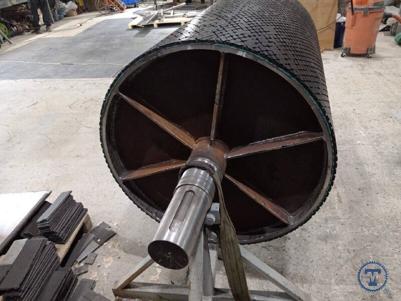 Компания Техмаш произвела приводной барабан диаметром 820 мм и длиной 1360 мм с установленной футеровочной резиной толщиной 8 мм. Барабан служит ключевым элементом привода, обеспечивая стабильное движение транспортной ленты.