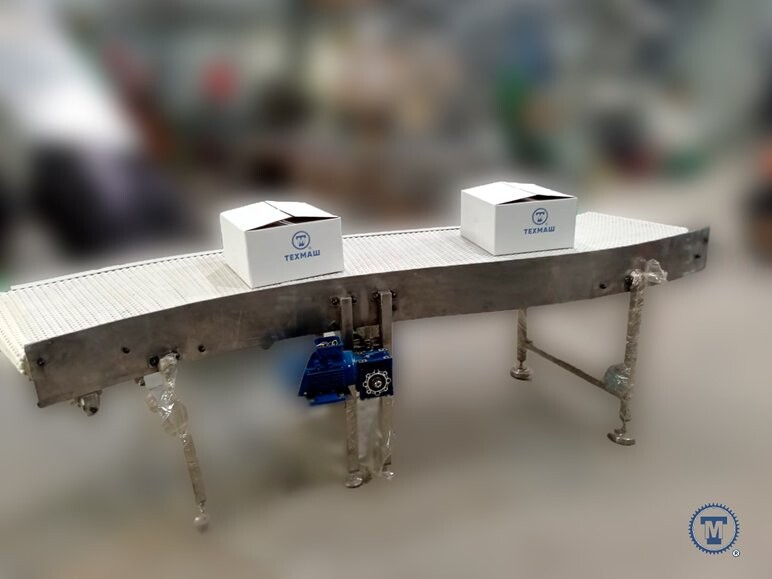 Завод Техмаш произвел поворотный модульный конвейер, который сочетает в себе прочность конструкции и удобство в использовангии. Транспортерное полотно собирается из пластиковых модулей, образующих единую систему для транспортировки продукции между этапами производства или подачи сырья на обработку, фасовку и хранение.