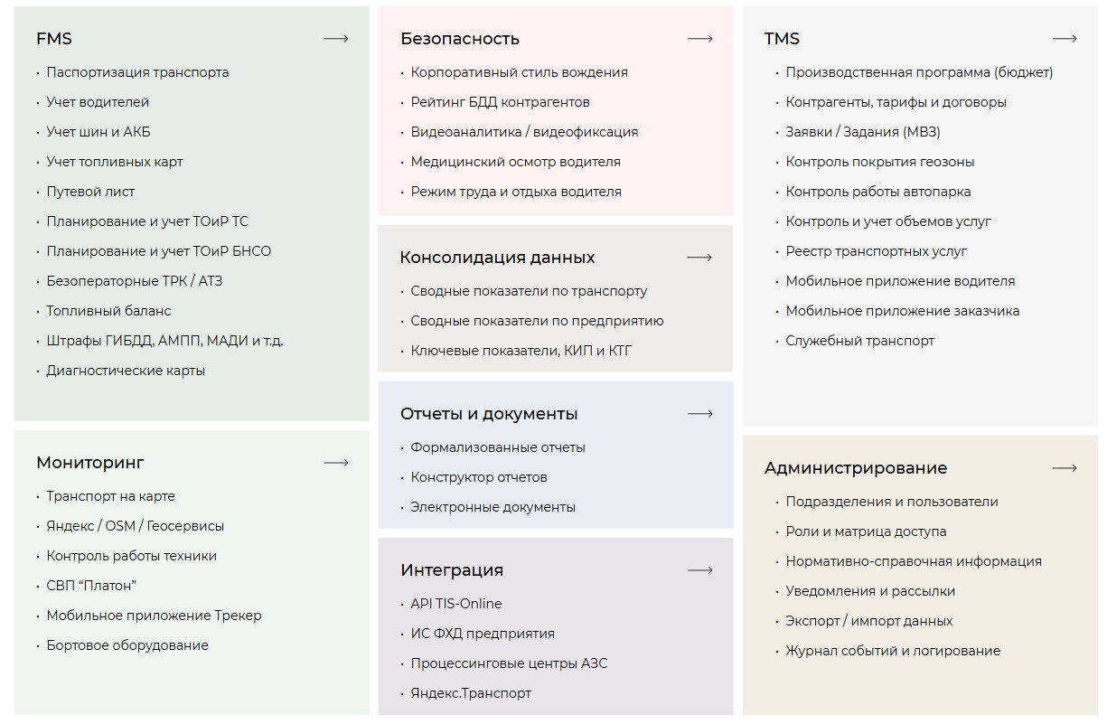 Такой набор позволяет не только отслеживать местоположение и состояние подвижного состава, но и контролировать производственные процессы, связанные с транспортом, распределять ресурсы, анализировать затраты и формировать управленческие отчёты.