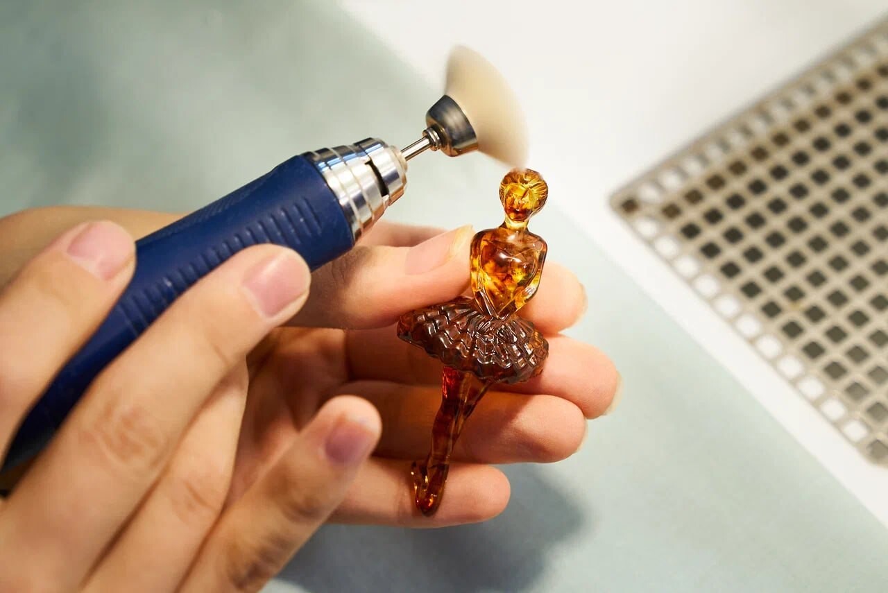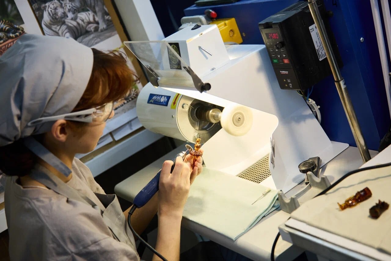 Эта кропотливая ручная работа относится к классическим ювелирным технологиям и позволяет создавать эксклюзивные изделия. Калининградский комбинат является единственным в мире предприятием, ведущим промышленную добычу и переработку янтаря. При поддержке Ростеха здесь была проведена модернизация горнодобывающего комплекса, обновлён парк спецтехники и организовано современное ювелирное производство.
