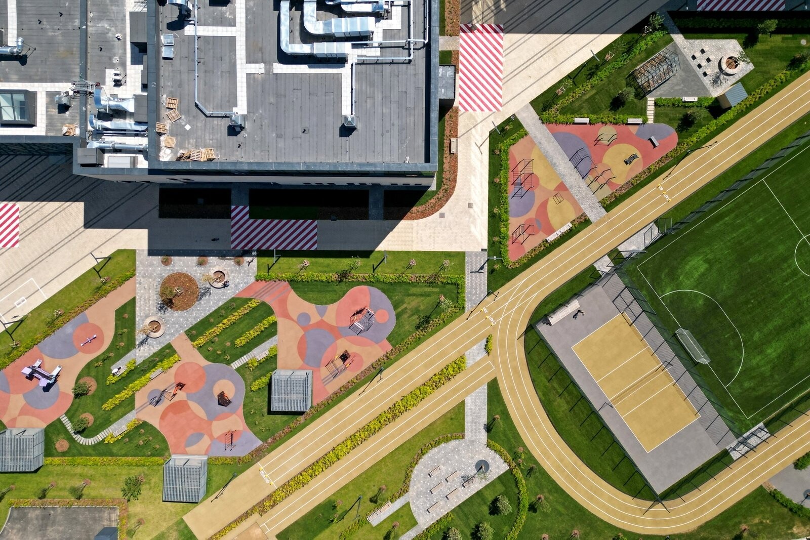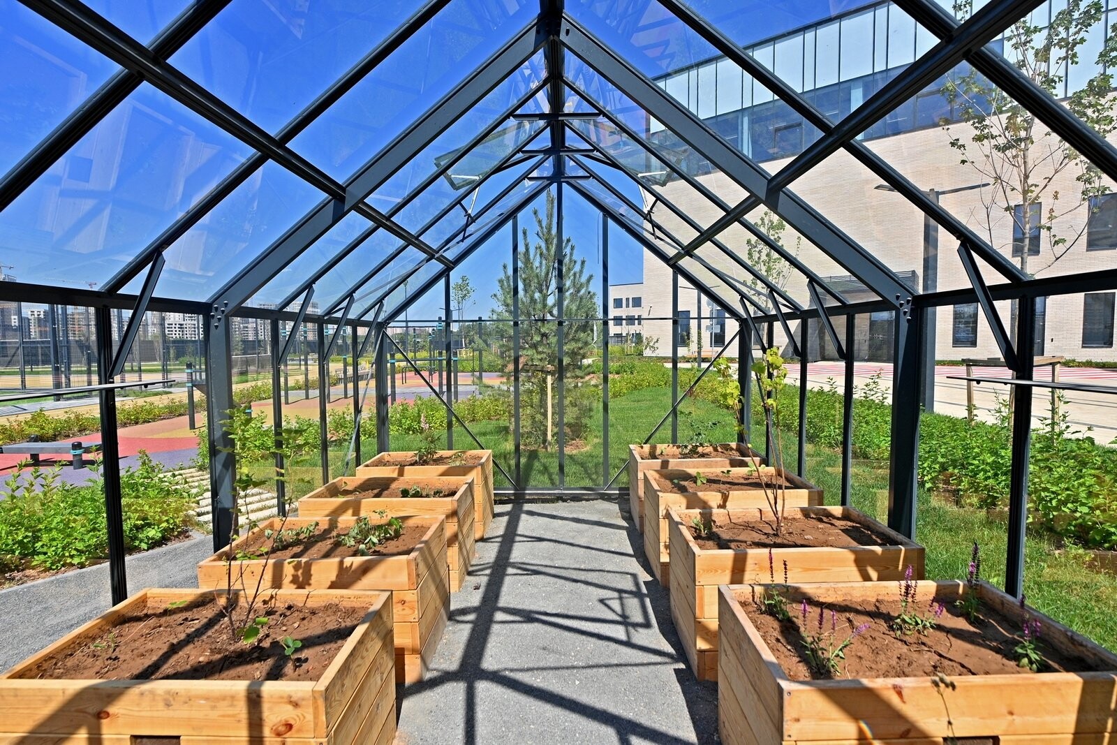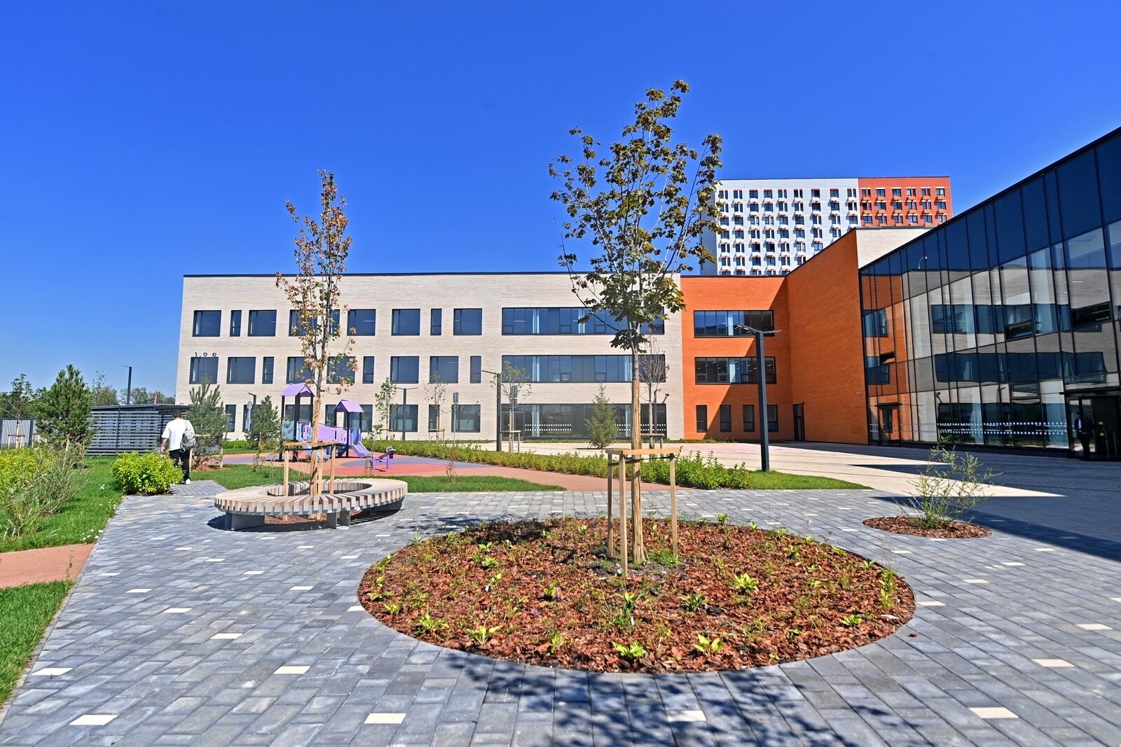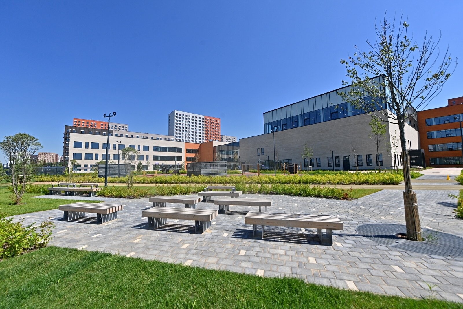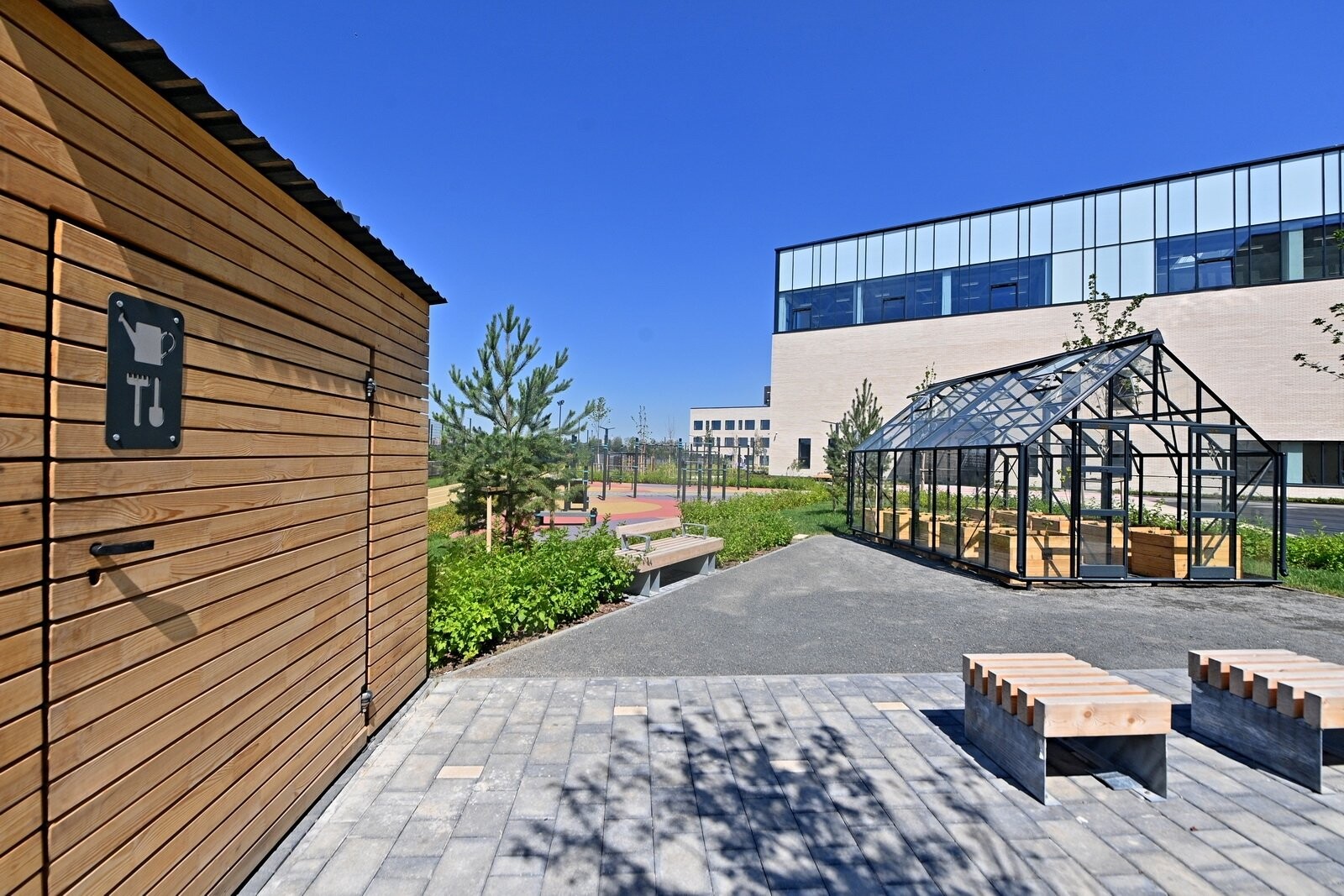 Рядом со зданием обустроили спортивное ядро с полем для мини-футбола, площадками для баскетбола и волейбола, зонами для подвижных игр, прыжков в длину и сдачи нормативов ГТО, а также территорией для тихого отдыха.