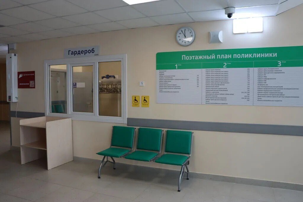 В поликлинике — профилактическое, консультативно-диагностическое, эндоскопическое отделения, дневной стационар на четыре койки, кабинеты неотложной помощи, пространства для телемедицинских консультаций специалистов. В учреждении предусмотрены зоны для кормления грудничков, кабинеты здорового ребёнка, прививочный пункт и офтальмологический центр. Ещё обустроено физиотерапевтическое отделение. Оно включает помещения для массажа, ЛФК и ингаляций.