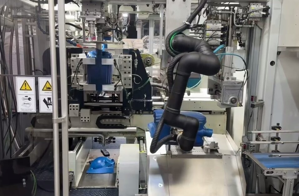 Интеграция роботизированного комплекса на базе кобота РОБОПРО (член Национальной ассоциации участников рынка робототехники) позволила автоматизировать обслуживание экструзионно-выдувных машин на предприятии по выпуску полимерной упаковки. Основной сложностью проекта стал дефицит свободного пространства в цеху, что исключало установку массивных промышленных манипуляторов с защитными ограждениями. Малогабаритный робот был внедрен в существующую технологическую цепочку с минимальными изменениями инфраструктуры, обеспечив высокую маневренность при выполнении циклических операций по выгрузке готовых изделий.