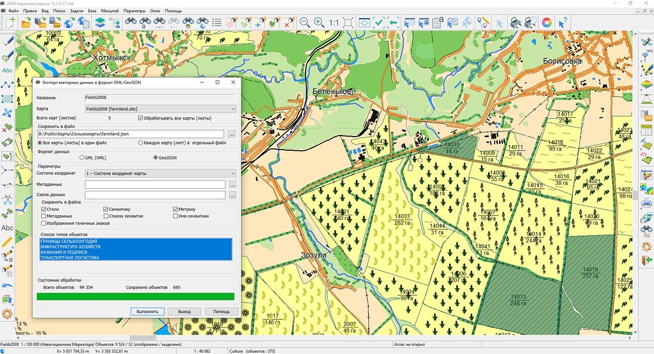 Существенно переработаны механизмы импорта и экспорта данных. При загрузке табличных данных из CSV, XYH и TXT пользователям доступна «тонкая» настройка: теперь можно указать последнюю строчку для обработки, исключая техническую информацию из конца файла. Кроме того, если в классификаторе для семантики разрешено повторение, одни и те же характеристики можно гибко назначать разным полям в рамках одной загрузки.Для обмена данными с внешними информационными системами доработан экспорт в форматы GML и JSON. Новая функция сохранения стилей позволяет выгружать точечные объекты вместе с их графическим изображением в соответствии с международным стандартом SLD (Styled Layer Descriptor), что упрощает интеграцию карт полей в отчеты и презентации без потери визуальной информативности.