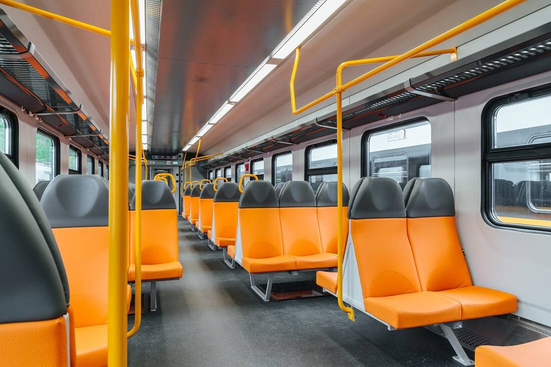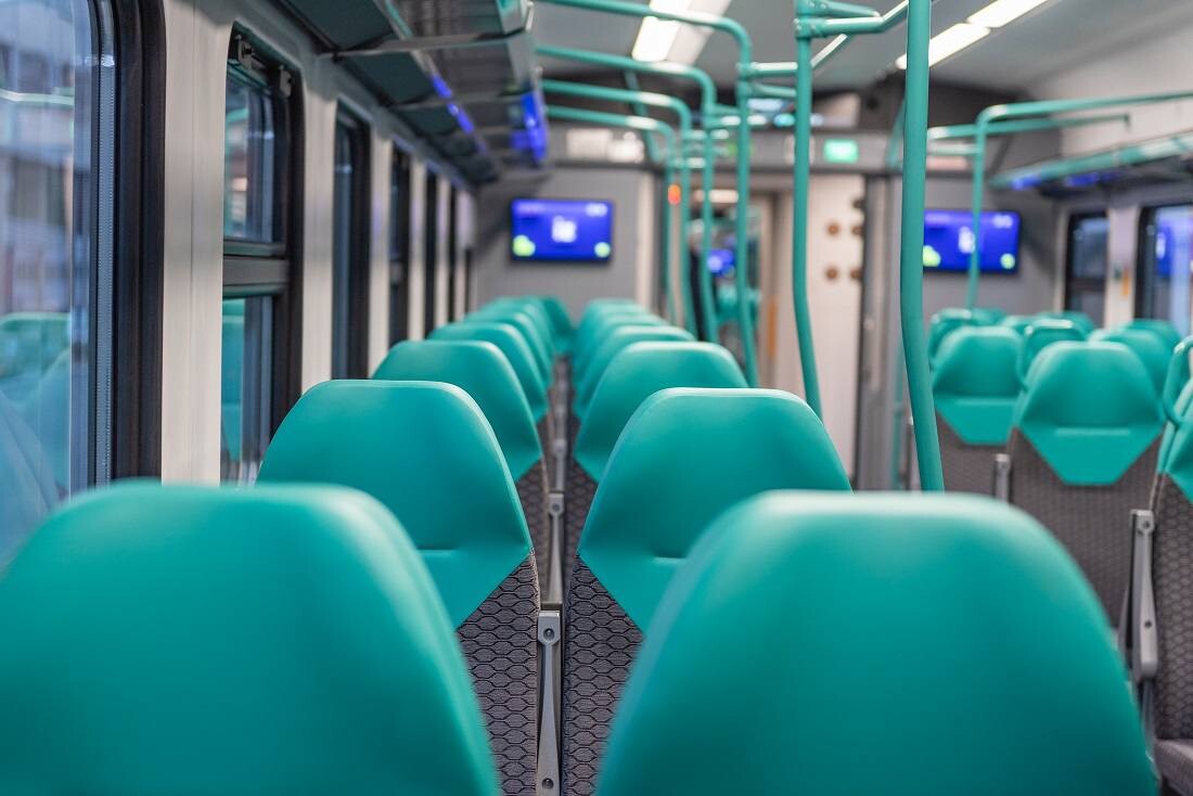 Состав рассчитан на 850 сидячих пассажиров. В салоне сдержанная серо-бирюзовая гамма, мягкие кресла с эргономичными спинками. У каждого — USB-разъемы двух типов: Type-A и Type-C, поддерживающие быструю зарядку. Для тех, кто едет стоя, предусмотрена система поручней.