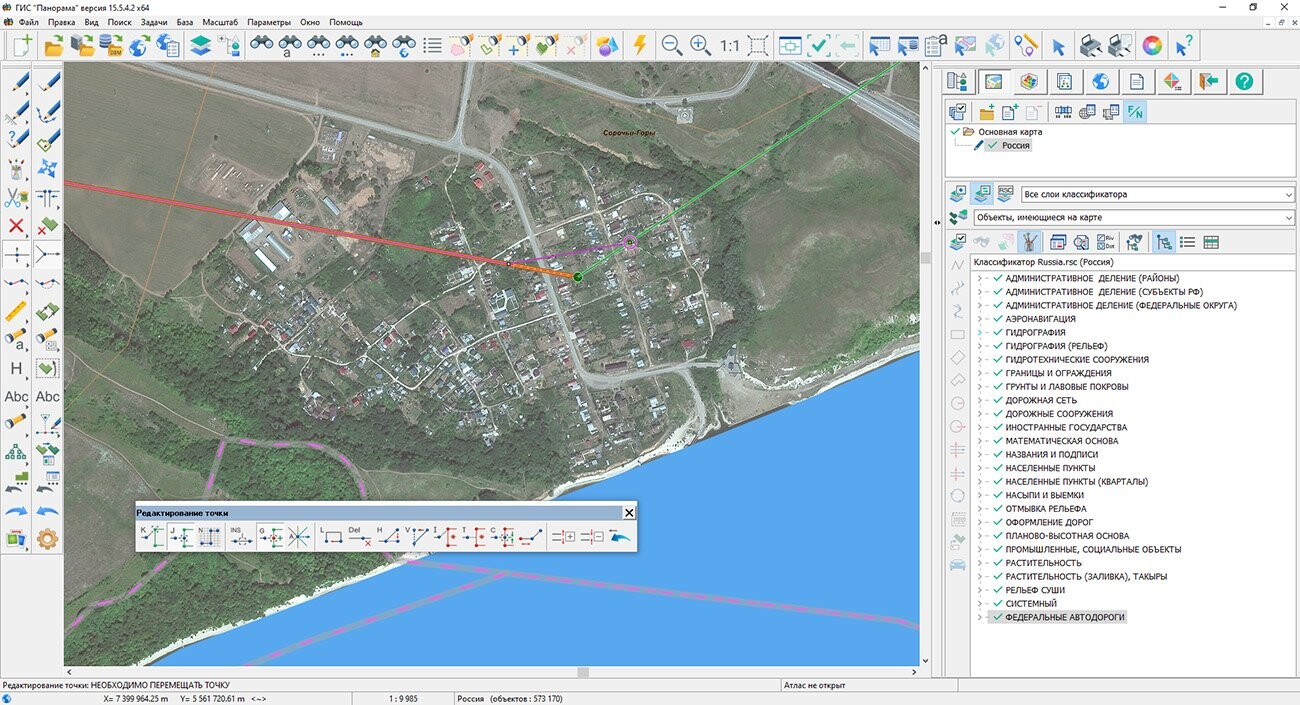 При редактировании объектов векторных карт в режимах «Создание объектов», «Создание по типу», «Редактирование точки», «Доцифровка линейного объекта» для операции «Захват точки контура» добавлена возможность позиционирования в центре отрезка. При захвате узла контура на экране появляется квадратный маркер, при захвате центра — маркер в виде ромба. Данный способ упрощает размещение точечных и векторных знаков на контуре другого объекта. Доработана сшивка площадных объектов. Перед сшивкой выполняется автоматическая подготовка контуров: удаление двойных точек и согласование соседних отрезков контуров с учетом расположения начальных точек внешних контуров относительно контуров присоединяемого объекта. Данная процедура позволяет повысить надежность выполнения сшивки объектов, имеющих наложение по площади.