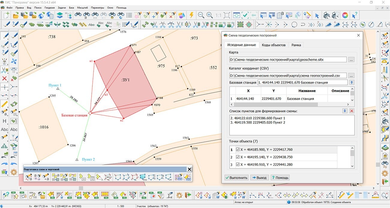Для режима «Схема геодезических построений» реализовано создание схемы геодезических построений для случая, когда базовые станции расположены на пунктах геодезической сети. Поддерживается формирование схемы без заполнения в диалоге сведений о базовой станции. На схеме создаются линии направлений «базовая станция — объект». Точки, не имеющие собственного названия, теперь на схеме обозначаются как новые.