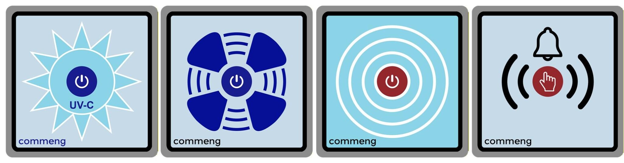 Панель Commeng CR CS-2601 используется для подачи сигнала включить/ выключить на управляемое реле (программируемое реле, реле времени, бистабильное реле), сигнала или питания на управляемое оборудование. Изображение на лицевую сторону нанесено в зависимости от назначения. На рисунке выше слева направо: управление УФ-облучателями, вентиояцией, освещением, звуковым сигналом.