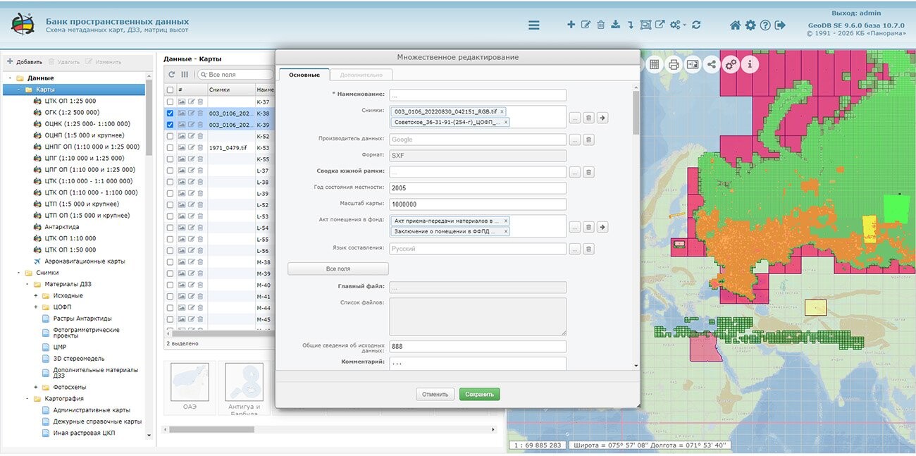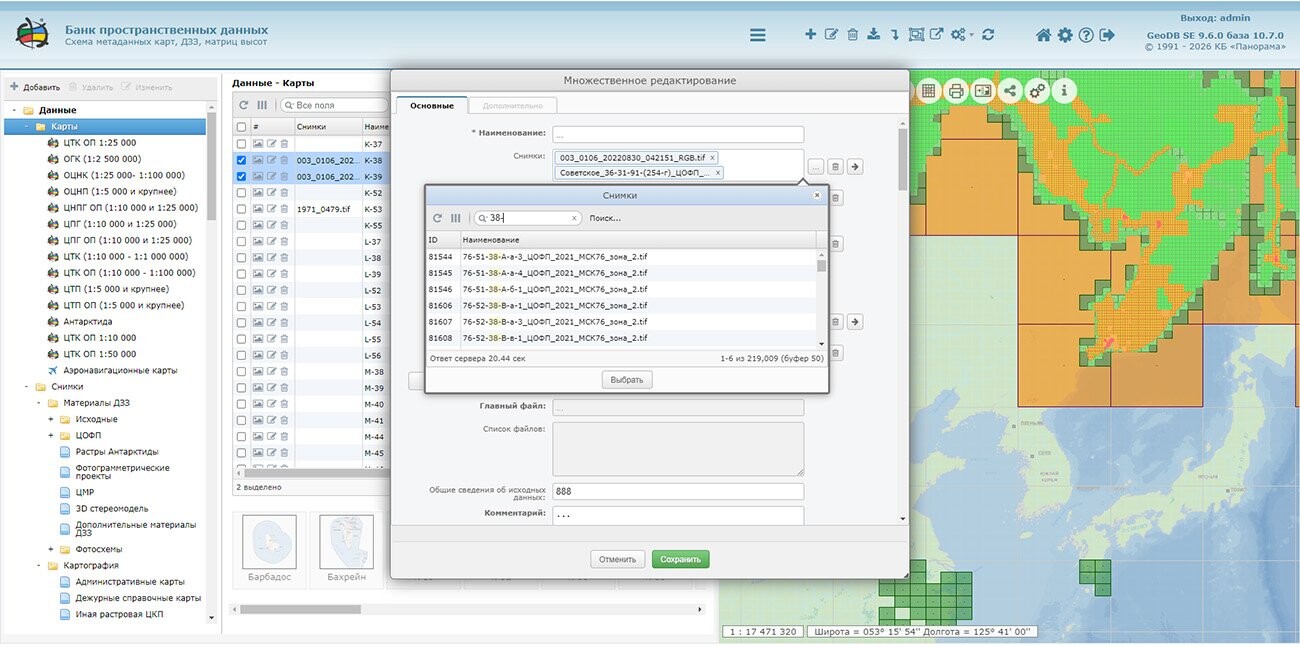В КБ «Панорама» разработан Банк данных цифровых карт и ДЗЗ версии 9.6.0. В новой версии реализована возможность организации и хранения связей между основными и дополнительными материалами геопространственных данных. Пользователи могут указывать, из каких снимков сформирован ортофотоплан, а также какие документы и материалы использовались при его создании. Обеспечивается доступ к каждому снимку и документу по отдельности. Реализован автоматизированный поиск всех файлов, связанных с конкретным растром, картой или матрицей. Связи между материалами могут задаваться при загрузке данных или в процессе редактирования метаданных. Функционал упрощает поиск и использование полного комплекта данных дистанционного зондирования Земли и повышает удобство работы с ними.