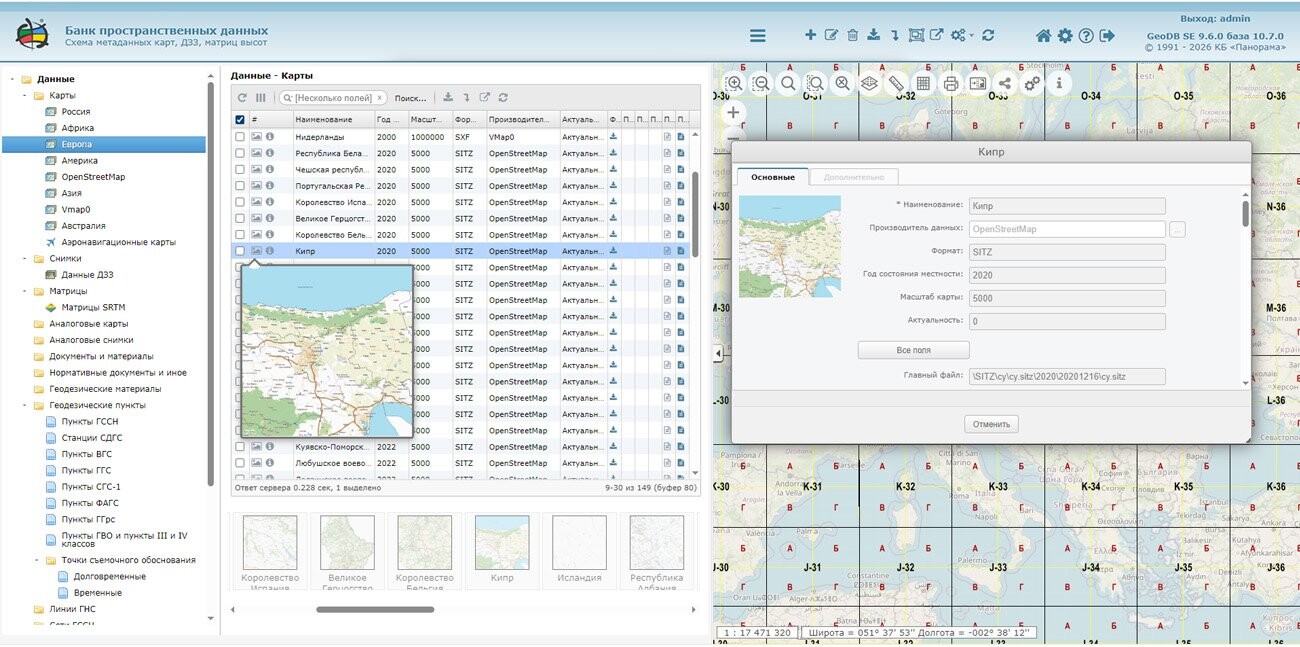 Безопасность данных обеспечивается разграничением прав доступа на основе средств безопасности, входящих в состав операционной системы. Поддерживается обычная проверка подлинности, дайджест-аутентификация, системная проверка подлинности (средствами веб-сервера) и доменная (Kerberos или ActiveDirectory). Дополнительная безопасность обеспечивается использованием сквозной аутентификации при работе с базой данных.Подключение к базе происходит с правами пользователя, работающего с системой. Комплекс адаптирован для работы на широком спектре операционных систем (Astra Linux SE, Ubuntu, РЕД ОС, MS Windows и других) и архитектур (Intel, Эльбрус, Байкал). Программа зарегистрирована в реестре отечественного ПО под номером 1862.Банк данных цифровых карт и ДЗЗ является основой для построения инфраструктуры пространственных данных федерального, регионального и муниципального уровней, в корпоративных информационных системах. В рамках единого геоинформационного пространства Банк данных цифровых карт и ДЗЗ реализует сбор, хранение, контроль качества, поиск и выдачу пространственных данных в обменных форматах. Отобранные с помощью программы пространственные данные могут быть размещены для многопользовательского доступа на ГИС Сервере и опубликованы по международным стандартам OGC WFS, WFS-T, WMS, WMTS, WCS на сервере приложений GIS WebService SE. Пользователи могут получить доступ к данным как из тонкого клиента (с помощью GIS WebServer SE), так и из настольных приложений (ГИС «Панорама», ГИС «Оператор»). Банк данных цифровых карт и ДЗЗ обеспечивает построение облачного хранилища пространственных данных, предоставление доступа к этим данным, автоматизированное формирование и обновление геопокрытий.Текущее состояние пространственных данных отображается с помощью карт-схем, которые ведутся для каждого типа хранимых данных: векторных карт, данных ДЗЗ, матриц высот и моделей местности. Обеспечивается удаленное помещение наборов пространственных данных в файловое хранилище, ведение версий хранимых наборов, обновление карт-схем наличия данных, автоматизированный сбор и формирование метаданных, формирование и обновление геопокрытий. Автоматизированный сбор и формирование метаданных выполняется по стандартам ISO 19115:2003, Geographic information — Metadata и ISO/TS 19139, Geographic information — Metadata — XML schema implementation. Автоматически формируются уменьшенные копии изображений данных, проверяются контрольные суммы файлов и полнота наборов данных. Помещение пространственных данных в файловое хранилище осуществляется с проверкой целостности, контролем структуры и содержания данных. Результаты работы протоколируются и заносятся в базу метаданных. Обеспечивается автоматическое резервное копирование метаданных и хранилища пространственных данных с контролем целостности и восстановлением данных. Поддерживается мультиязычный интерфейс.На портале «Банк пространственных данных» демонстрируются возможности по организации хранения, учета и выдачи векторных карт, данных ДЗЗ, матриц высот и моделей местности. Портал содержит векторные карты в формате SXF, сформированные на основе данных из открытых источников (OpenStreetMap, VMap0). В состав пространственных данных входят карты: субъектов РФ, стран и городов ближнего и дальнего зарубежья. Всего свыше 450 векторных карт и 6 700 матричных данных общим объемом более 250 Гб. Специа