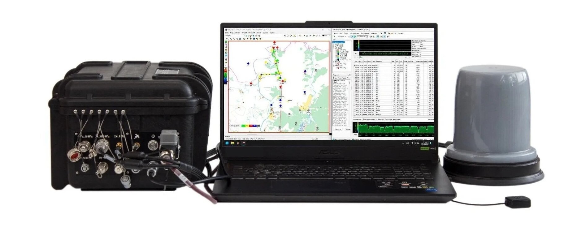 — Работа с радиотехнологиями: GSM, UMTS, LTE-FDD/TDD, 5G NR, NB-IoT, CDMA (IS-95, cdma2000, EV-DO, IMT-MC-450), WiMAX, TETRA, DMR, dPMR, NXDN, APCO P25, Wi-Fi, LoRaWAN, Bluetooth, Zigbee, DECT, DVB-T/T2/H, DTMB;— Диапазон рабочих частот от 20 МГц до 30 ГГц;— Обработка сигналов в реальном времени;— Режим автоматического обнаружения и идентификации сигналов;— Запись и хранение данных для постобработки и формирования отчетов; — Питание от внешней сети, бортовой сети автомобиля, а также от аккумуляторов до 4 часов автономной работы в переносном исполнении в рюкзаке или сумке;— Степень пыле-влагозащиты защитного кейса — IP65;— Диапазон рабочих температур — от -20 до +55 °C.