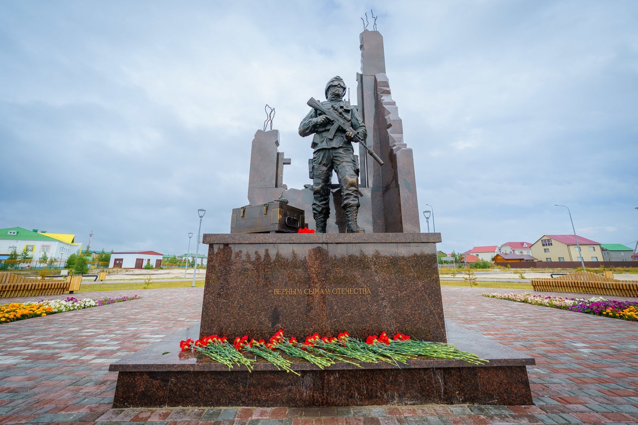 Появилась и главная доминанта Аллеи Славы — монумент «Верным сынам Отечества». Это бронзовая скульптура бойца с винтовкой в защитной балаклаве, очках и шлеме на обломках разрушенного здания. Постамент выполнен из гранита. Общая высота памятника — почти 6 метров.