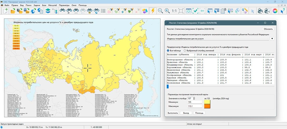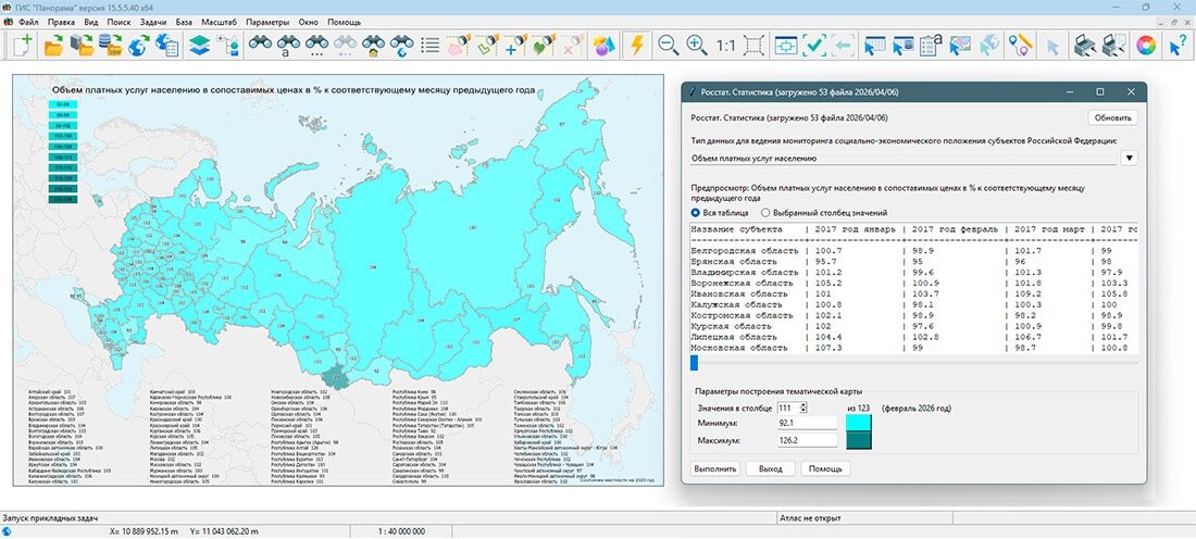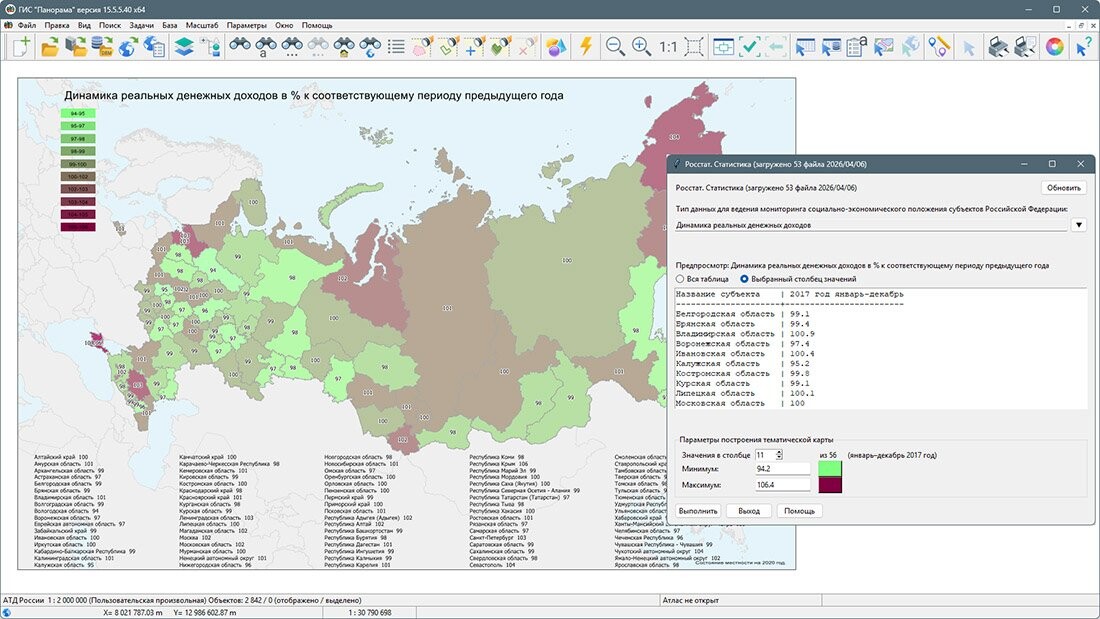 В КБ «Панорама» подготовлен программный модуль тематического картографирования по данным Росстата, позволяющий автоматически создавать наглядные карты социально-экономических показателей по субъектам Российской Федерации. Новый режим предназначен для работы с официальными сводными таблицами Росстата и обеспечивает быстрое преобразование табличных данных в готовую тематическую карту. Пользователю достаточно выбрать интересующий показатель, указать столбец со значениями, а система автоматически выполнит расчет градаций, подберет цветовую шкалу и сформирует векторную карту с легендой и подписями.