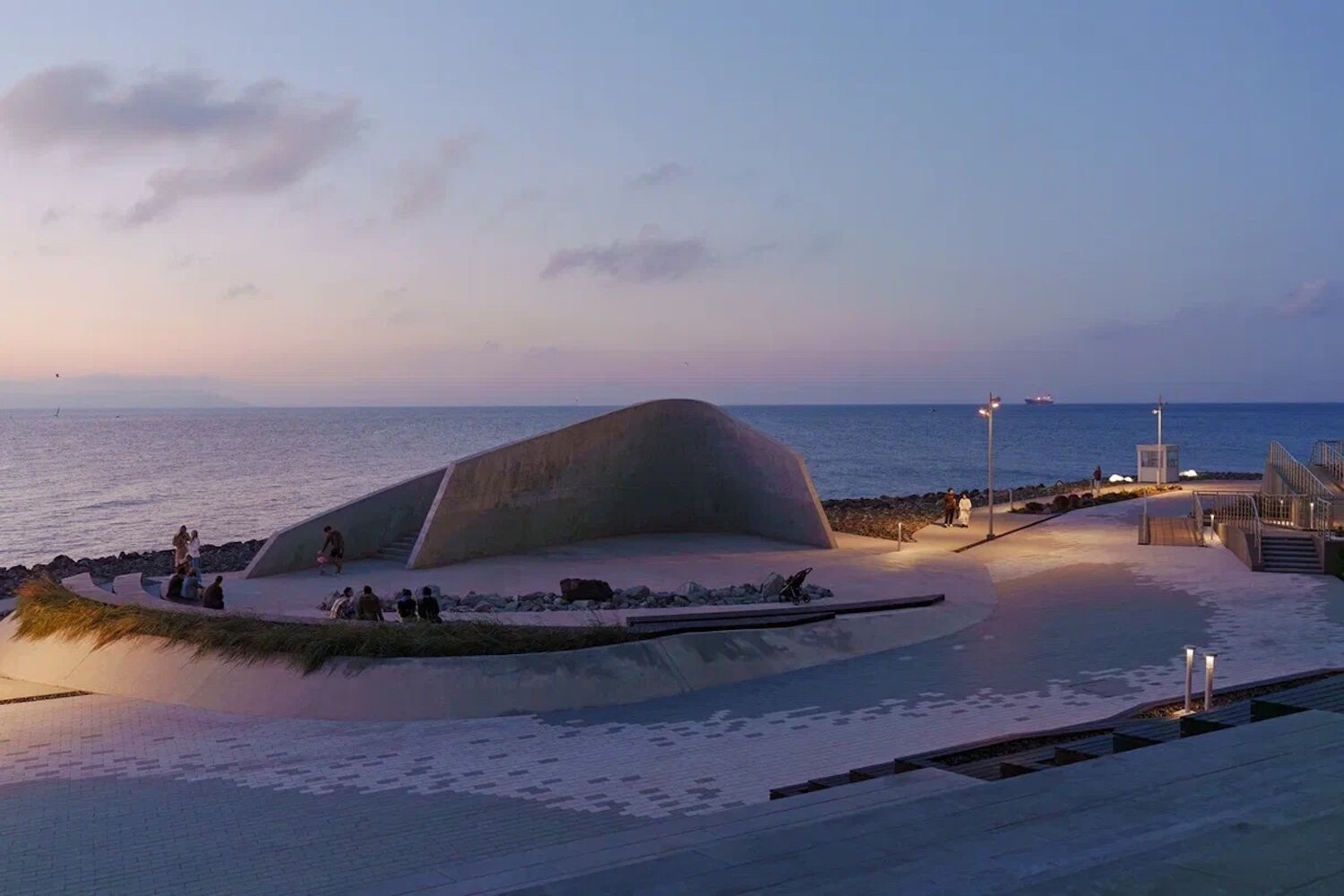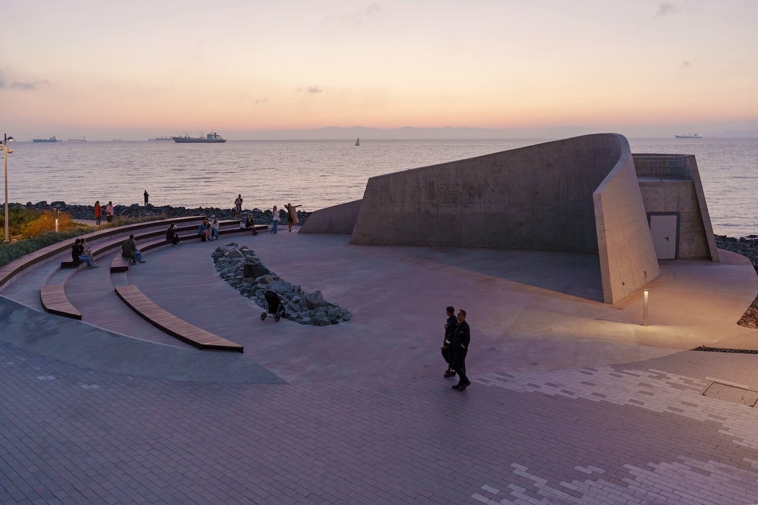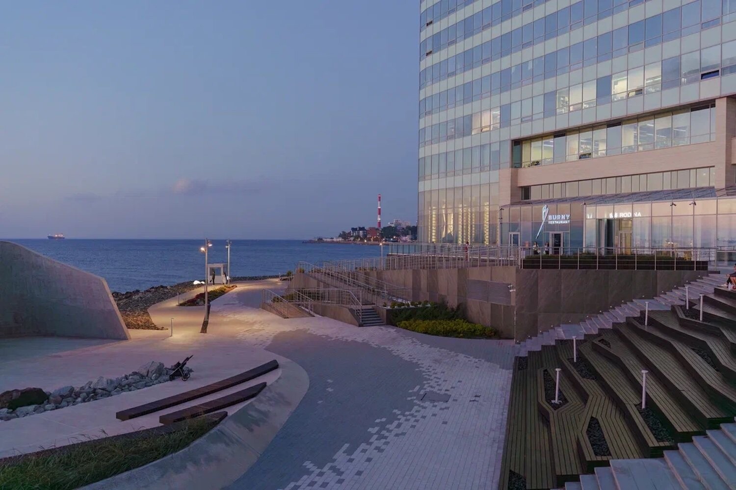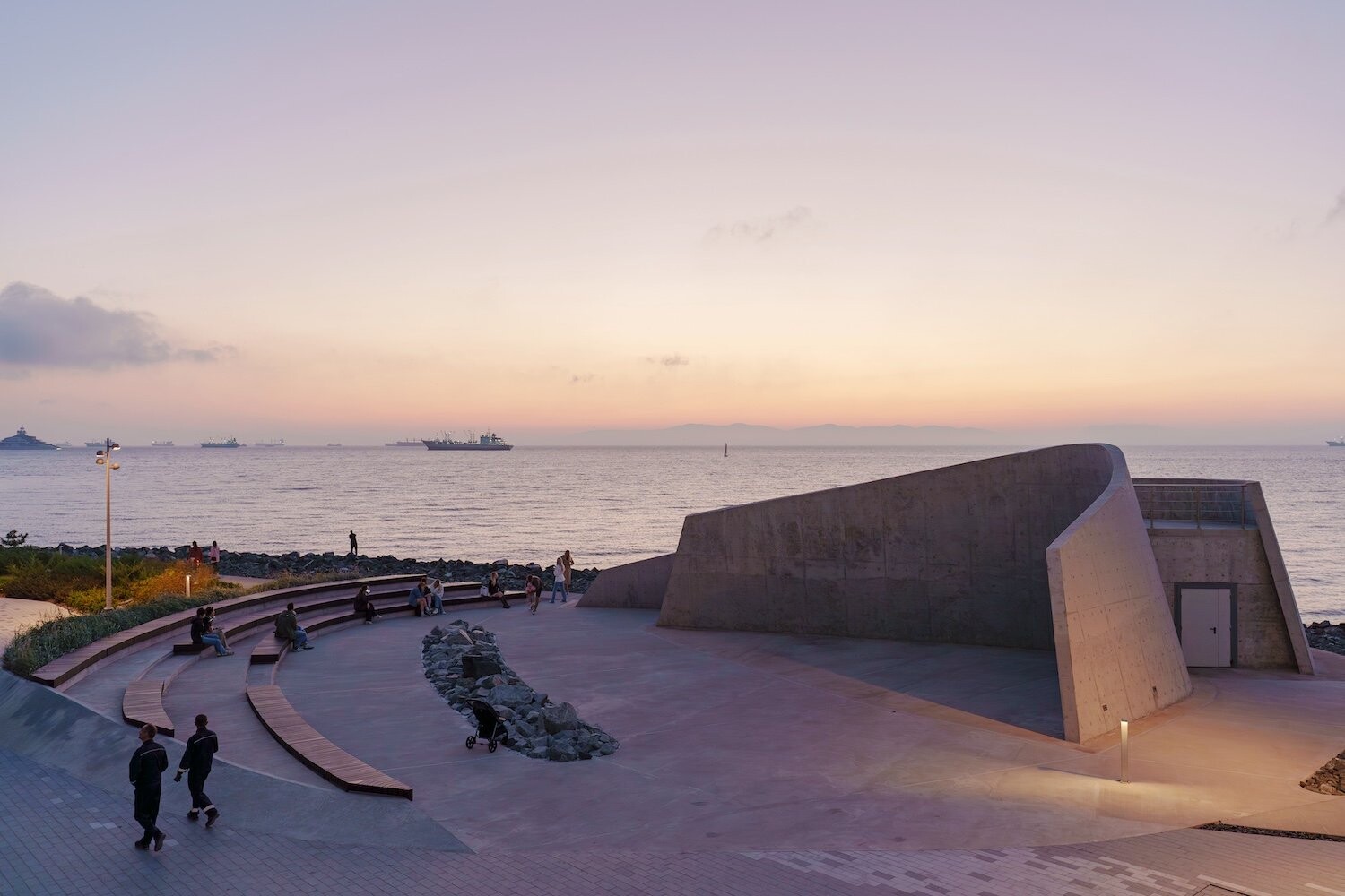 Комплекс занимает насыпную территорию мыса Бурного — открытую, продуваемую ветрами, с панорамными видами на акваторию. Красота приморского пейзажа здесь не фон, а активный участник проекта. Проект реконструкции опирается на стратегию программируемого насыщения: набережная наполняется новыми общественными сценариями, при этом ее подлинная идентичность — каменистая, «жесткая» структура берега — не маскируется, а развивается. Концепция разрабатывалась с учетом сейсмической активности региона, сложного морского климата и агрессивной соленой среды.