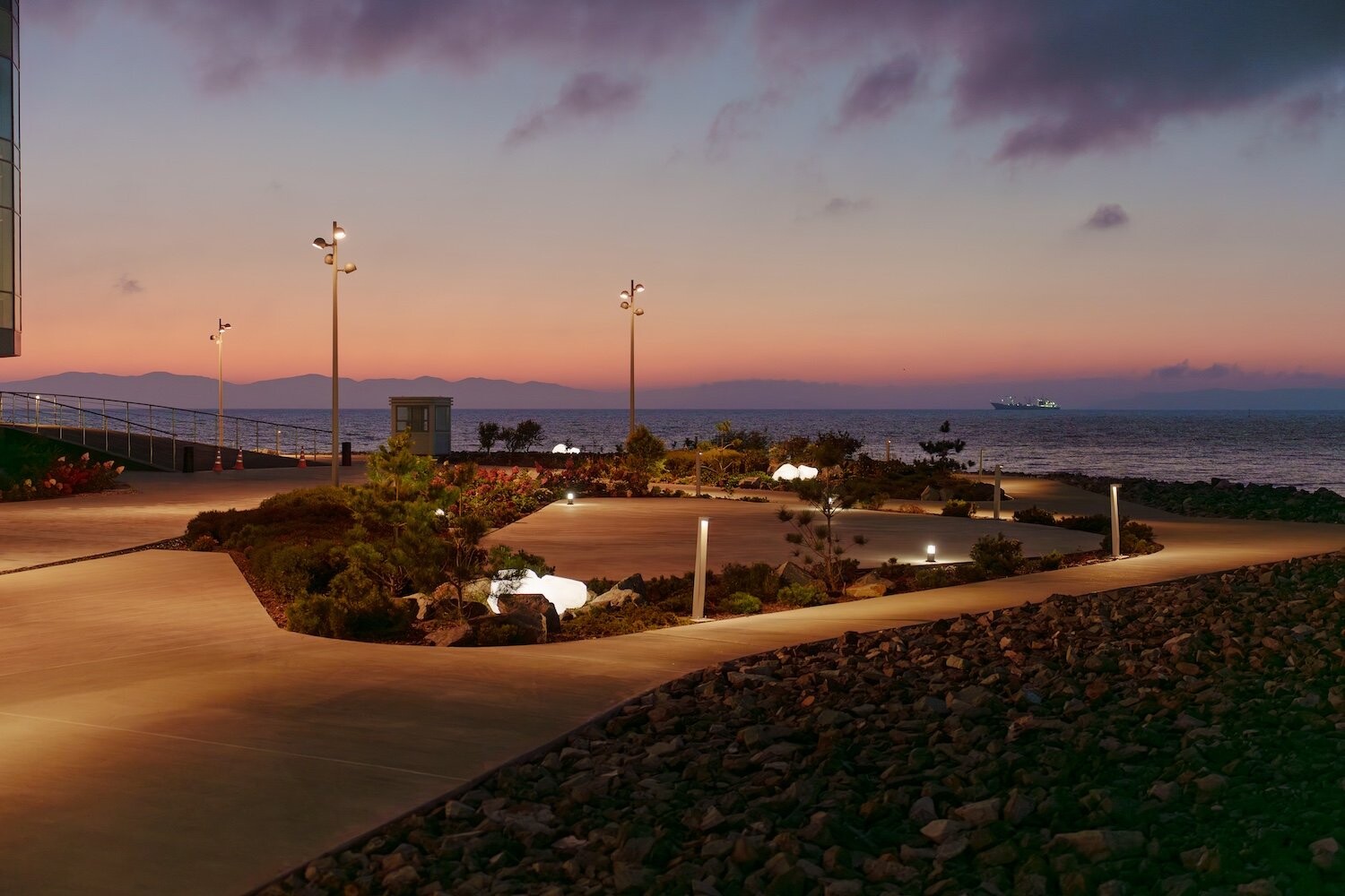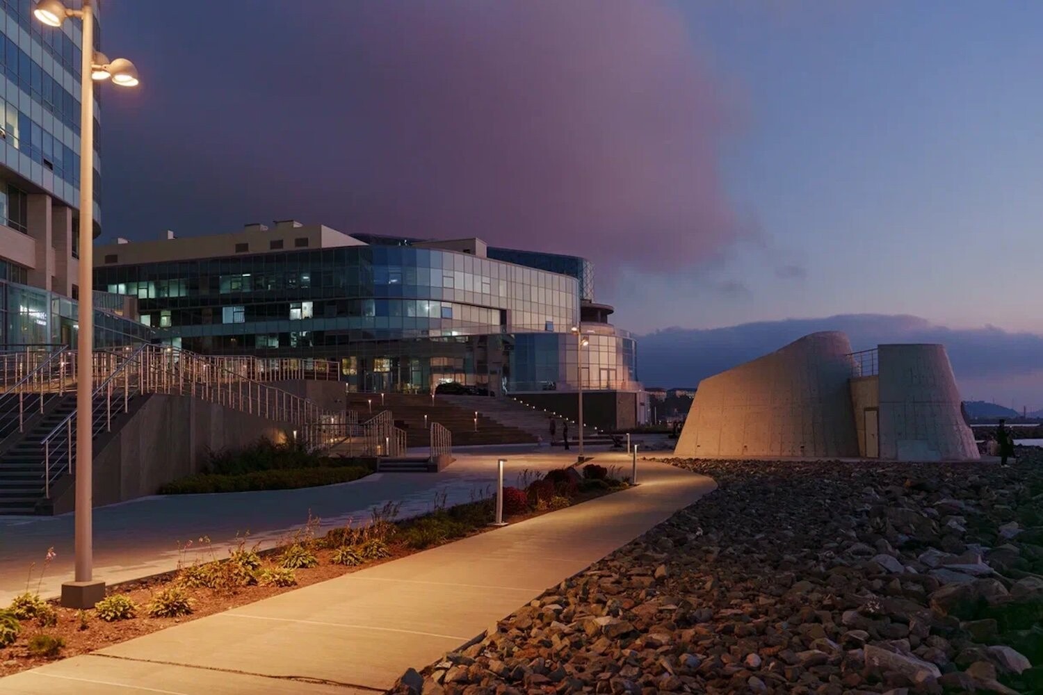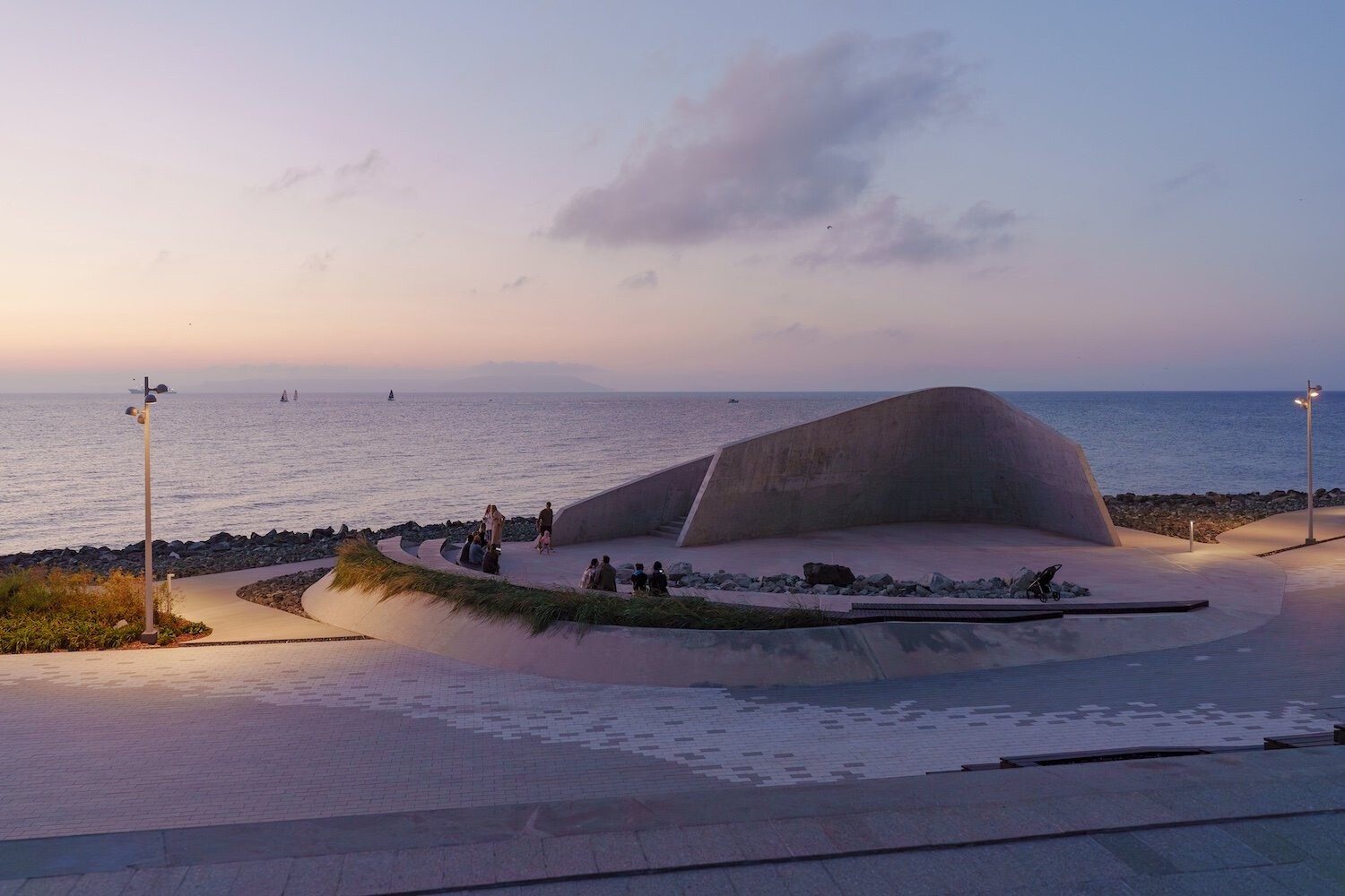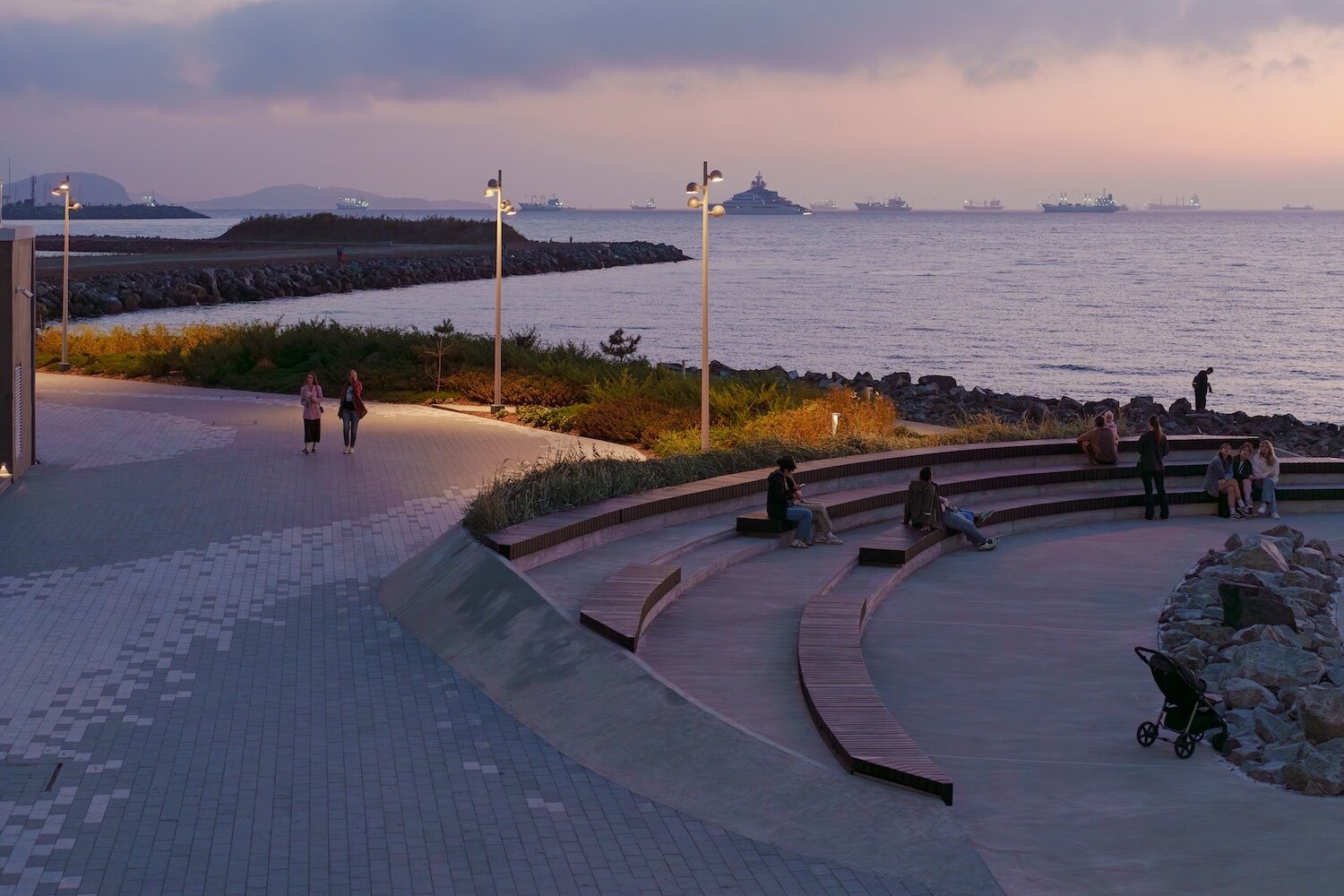 Комплекс занимает насыпную территорию мыса Бурного — открытую, продуваемую ветрами, с панорамными видами на акваторию. Красота приморского пейзажа здесь не фон, а активный участник проекта. Проект реконструкции опирается на стратегию программируемого насыщения: набережная наполняется новыми общественными сценариями, при этом ее подлинная идентичность — каменистая, «жесткая» структура берега — не маскируется, а развивается. Концепция разрабатывалась с учетом сейсмической активности региона, сложного морского климата и агрессивной соленой среды.