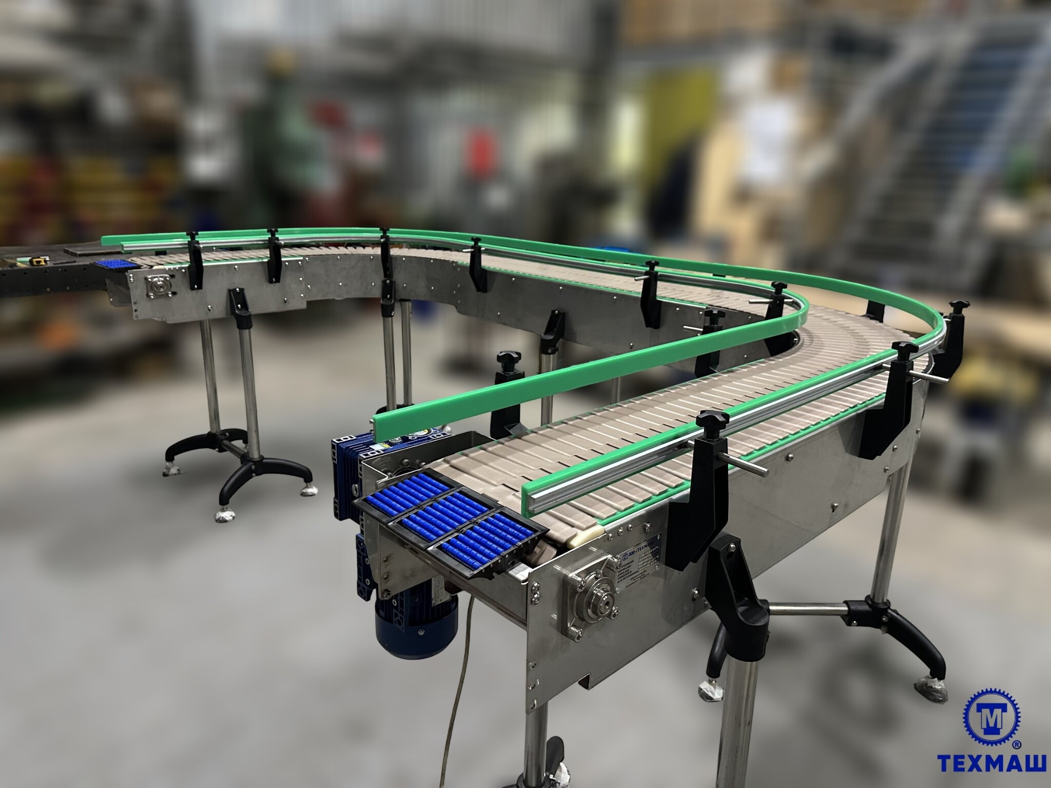 Компания «ТЕХМАШ» изготовила два пластинчатых конвейера для линии розлива: прямой и поворотный. Пластинчатые конвейеры — это транспортные системы, в которых груз перемещается по пластинчатым цепям или модульным лентам. В отличие от ленточного конвейера, они не провисают и лучше выдерживают высокие нагрузки, воздействие температуры и механические повреждения.