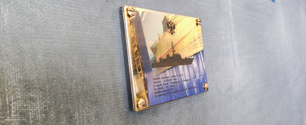По традиции к элементу килевого набора будущего тральщика прикрепили закладную доску с памятной информацией о дате и месте постройки, после чего секция заняла свое место на корпусе корабля.