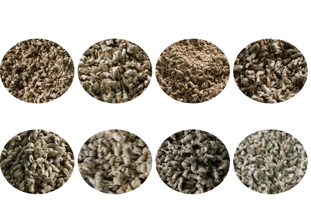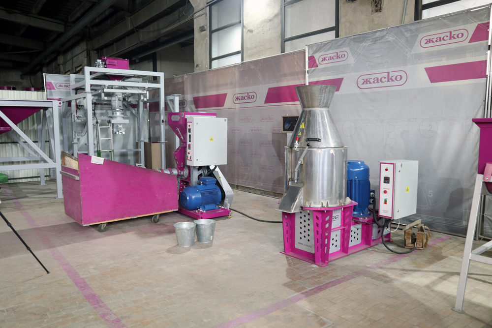 Переработка осуществлялась на сушильно-измельчающем блоке и экструдере ПЭ-450. В ходе испытаний было проведено восемь циклов смешивания с различными рецептурами и зерновыми наполнителями. Соотношения сырья и наполнителя варьировались: 1:1 и 1:1,5. В качестве наполнителей использовались: жмых, ячмень, отходы от пшеницы с крупозавода, цельная и дроблёная кукуруза. Также проводились временные тесты: время обработки варьировалось 7 и 10 минут для достижения оптимальной влажности смеси.