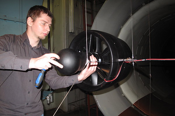 Прежде чем приступить к пробным полетам, беспилотник испытывают в аэродинамической трубе. Скорость воздуха здесь 130 километров в час. Аппарат прикрепляют к аэродинамическим весам. Так можно измерить вектор силы, чтобы потом рассчитать траекторию.