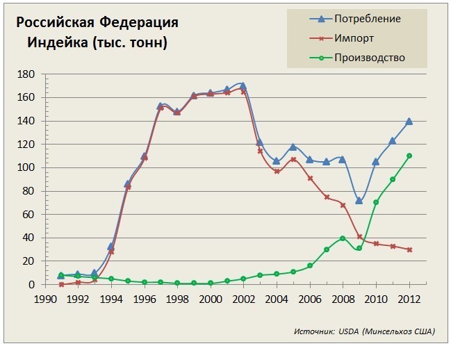 Если все мечты осуществятся, «Евродон» сможет производить до 300 000 т мяса индейки к 2020 году. Конкуренты пытаются не отстать. Например, компания «Дамате» Наума Бабаева весной этого года запустит первую очередь производства на 15 000 т мяса индейки, а группа «Черкизово» — в следующем году на 25 000–30 000 т. Съест ли столько российский потребитель? Мушег Мамиконян уверен, что рынок возьмет все, главное — предложить. По оценке Мясного союза, потенциальная емкость российского рынка в ближайшие несколько лет — минимум 300 000 т индейки. Россияне пока съедают порядка 150 000 т, из них на отечественных производителей приходится около 85%.