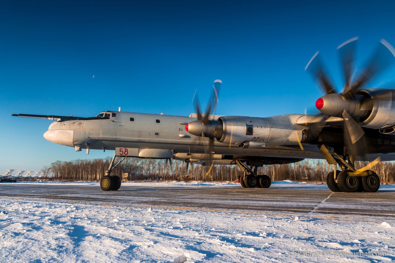 Смотрятся очень эффектно, кадры приводят в восторг — яркое солнце на закате, снежный покров летного поля, морозный воздух и прозрачное голубое небо И снова взлет Ил-78 заходит на посадку Офигенные краски в зимних сумерках Руление после посадки Ту-95МСИсточники: chkala_crew — полёты в Дягилево, vector-force.ru