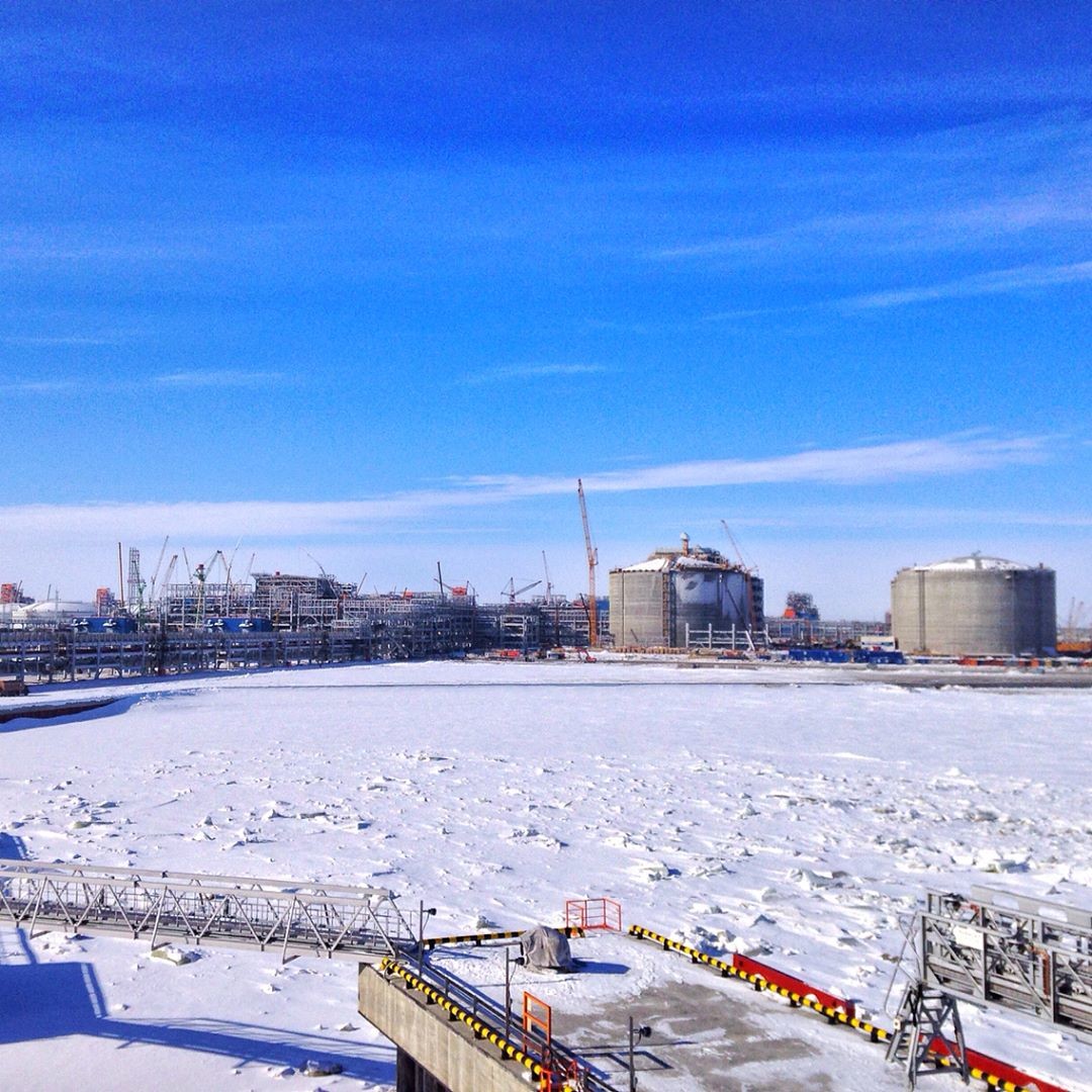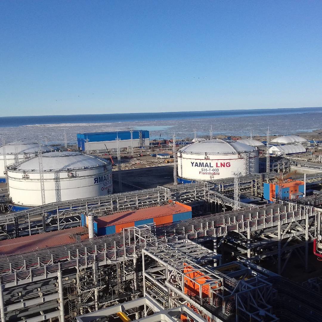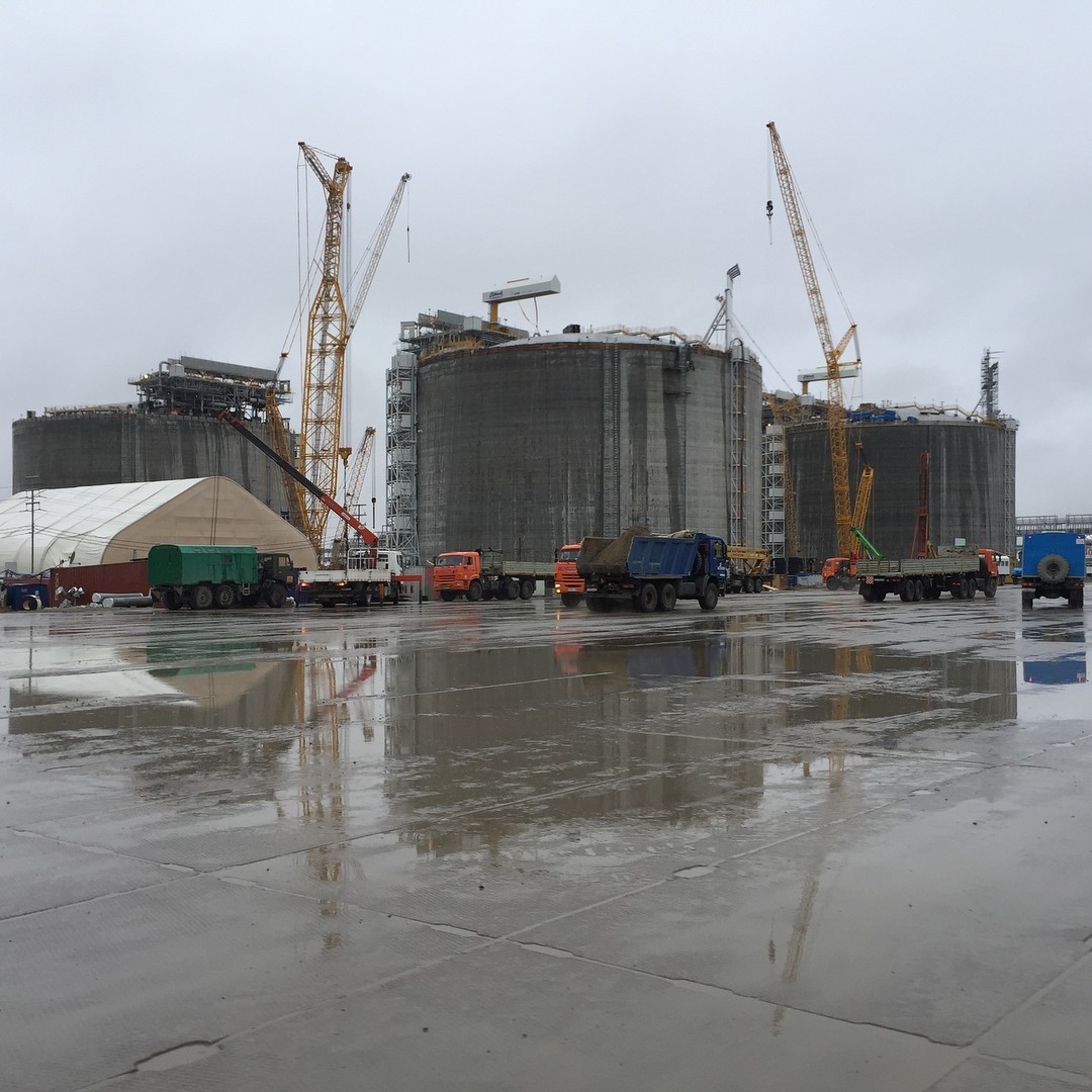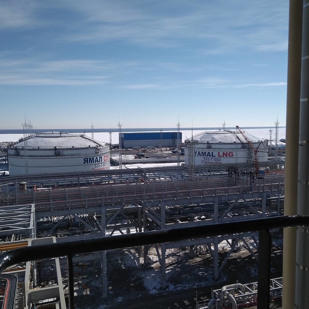 Четыре резервуара емкостью 160 тыс. куб. м каждый. Диаметр — 90 м, высота — 50 м. Предназначены для хранения СПГ при температуре минус 164 °C до последующей отгрузки на СПГ-танкеры. Справа два резервуара для первой технологической линии завода, готовы к запуску, слева по одному резервуару для второй и третьей линий. Справа от 4ех резервуаров, за эстакадой, линия повторного сжижения газа, помогает регулировать процессы хранения и перегрузки СПГ. На факельной установке свечение пламени, значит газ по линии уже идет.