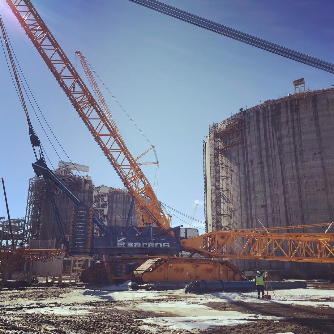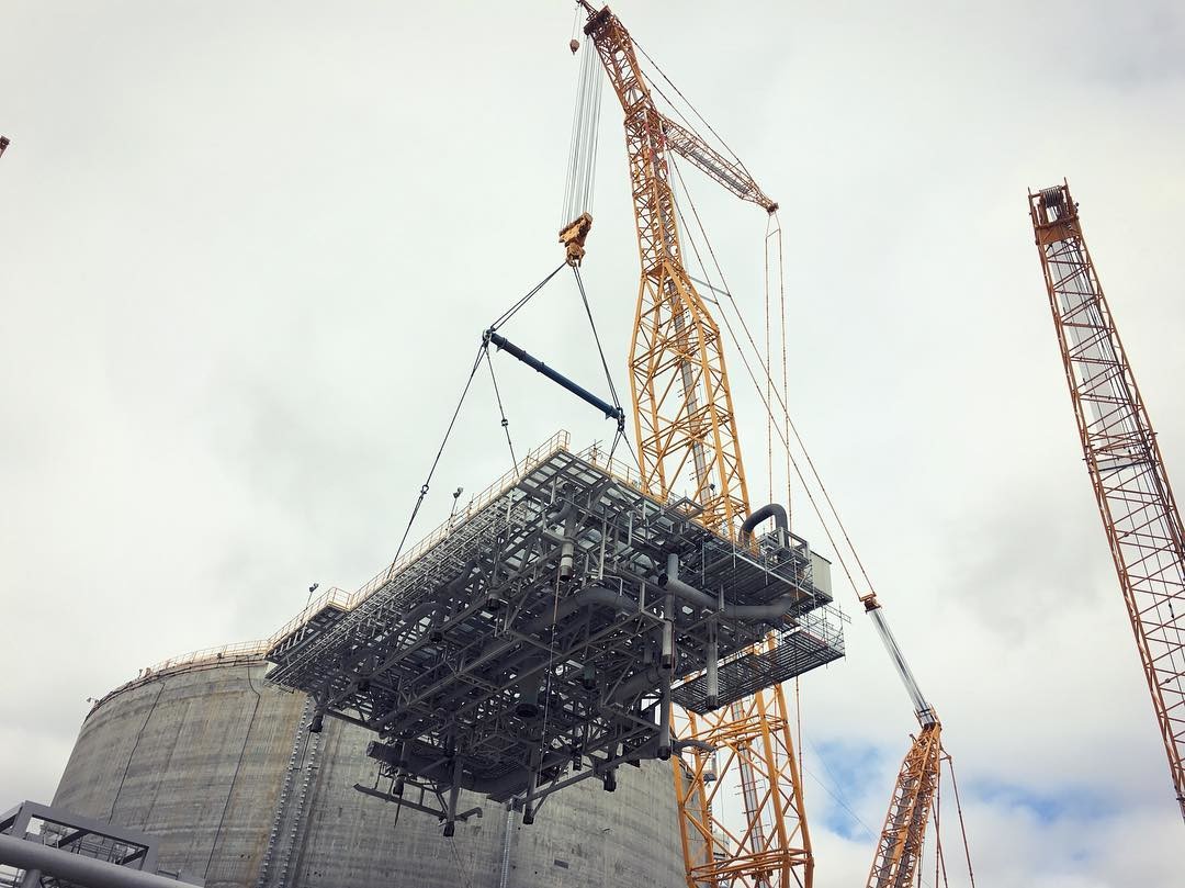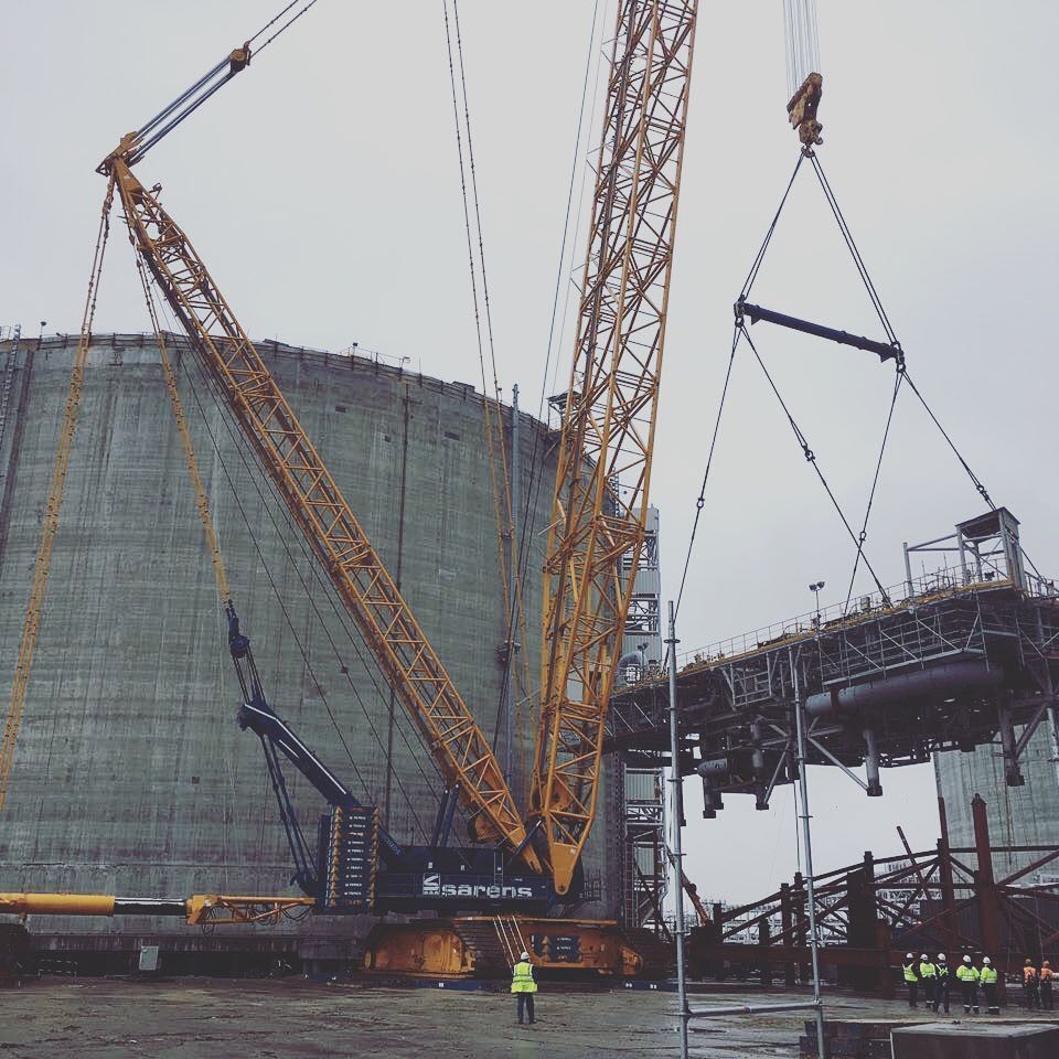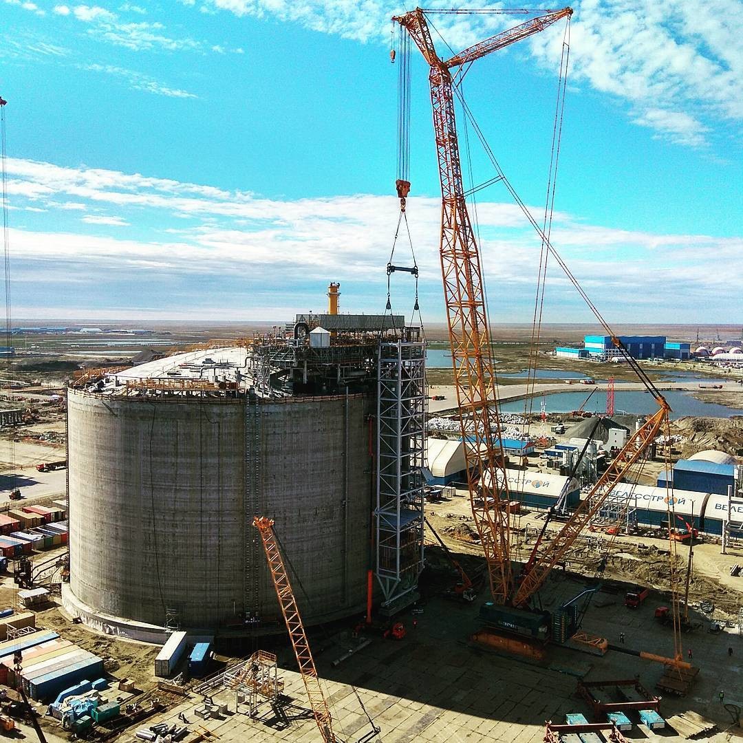 июль 2017 Монтаж платформы весом 560 тонны на 3ий резервуар СПГ объемом 160 тыс. куб.м, кран грузоподъемностью 1600 тонн
