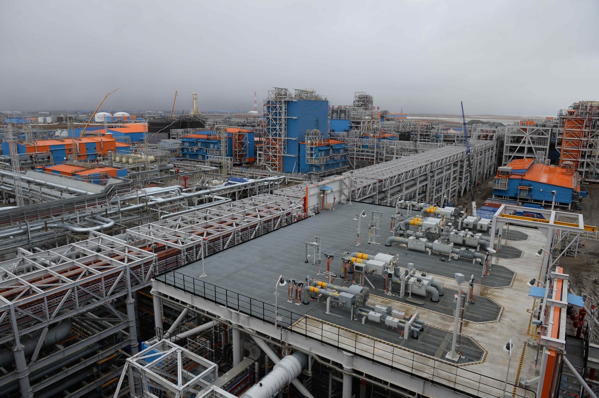 Слева на заднем плане резервуары, справа завод, вид на первую и вторую технологические линии, справа налево, вдали синева Обской губы. На переднем плане площадку разрезает западная трубная эстакада или эстакада с инженерными системами. Предназначена для подачи газа от входных сооружений на технологические линии СПГ-завода. Состоит из модулей, в которых проложены трубопроводы, кабели коммуникации и энергоснабжения.
